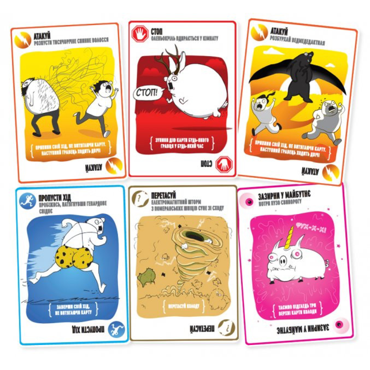 Гра для людей з гарним почуттям гумору. Гра здатна миттєво поліпшити настрій навіть одними малюнками на картах. До того ж вона настільки затягує, що практично неможливо відірватися. Напруга зростає щосекунди, шансів залишитися в живих все менше. Хто ж з гравців залишиться єдиним щасливчиком?