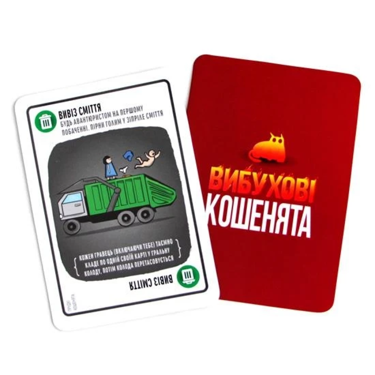 Гра пропонує випробувати удачу за методом російської рулетки. Учасники по черзі тягнуть карти, і якщо хтось витягує вибухове кошеня, він вибуває з гри. Також гравці можуть розіграти певну кількість наявних на руці карт, серед яких деякі можуть врятувати від вибуху, інші дозволять подивитися на три верхні карти в колоді, перш ніж добирати. Є такі карти, що дають можливість припустити хід, змушують противника добрати кілька карт або взагалі крадуть у нього карту з руки.