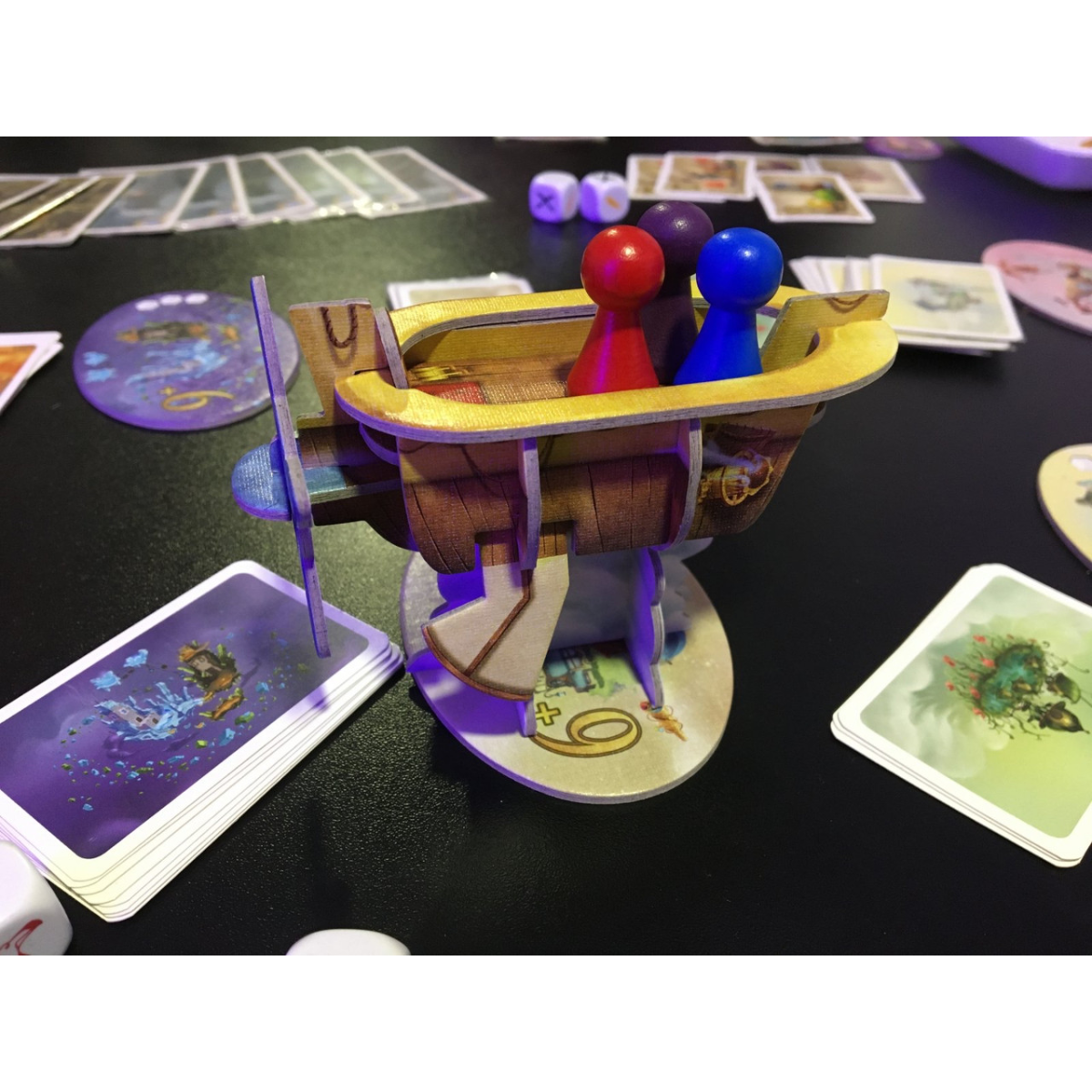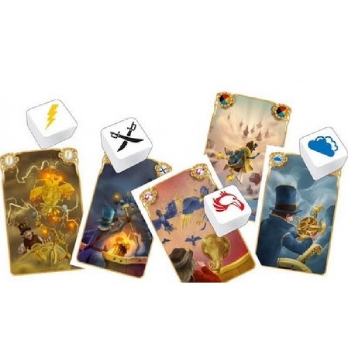 Карти сили дають змогу висадити пасажира з корабля, зістрибнути з корабля вже під час польоту або перекинути кубики. Є і карта “Тяжого удару“, яка змушує капітана перекинути кубики з білими гранями. Карта скарбів «Магічна підзорна труба» переміщує корабель у наступне місто, нехтуючи всі перешкоди. На мапах скарбів зазначено, скільки очок вони приносять.
