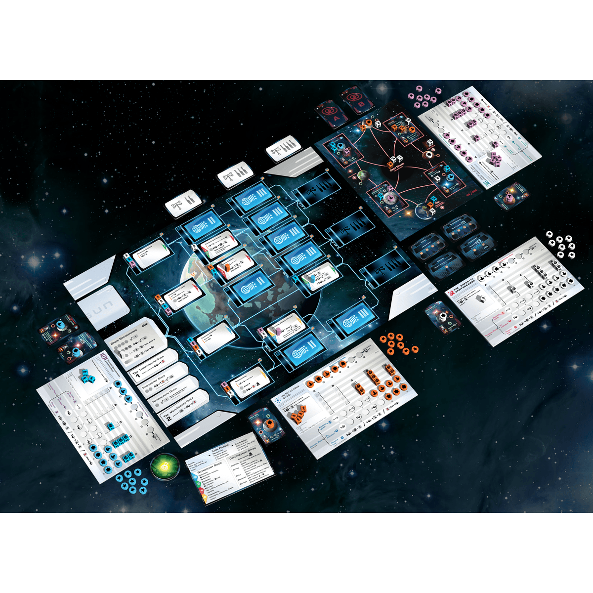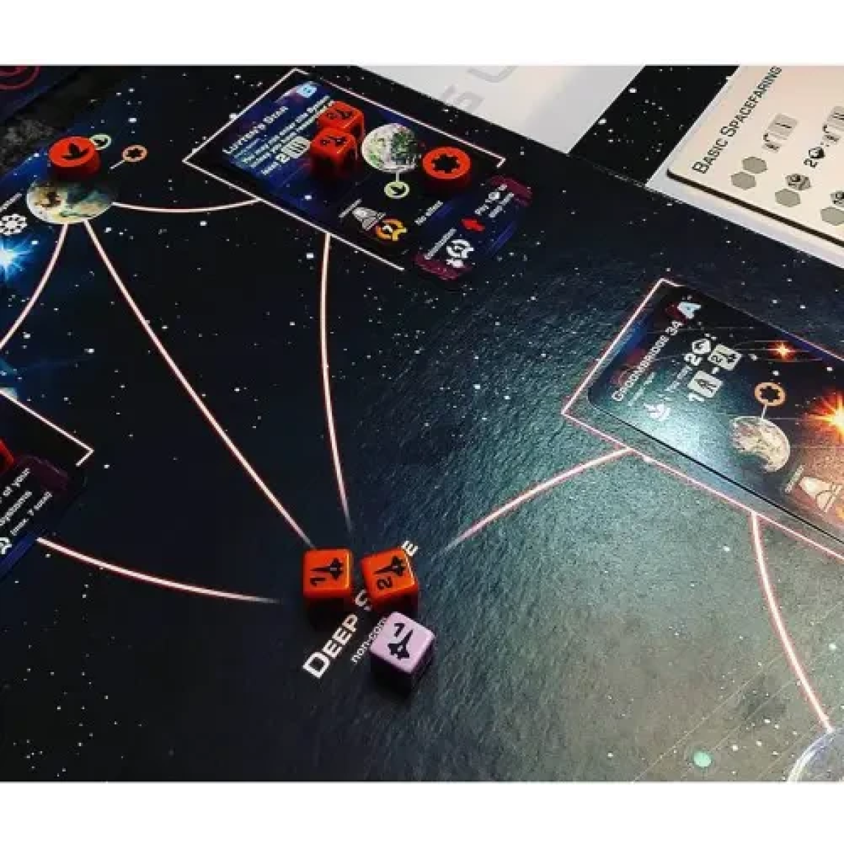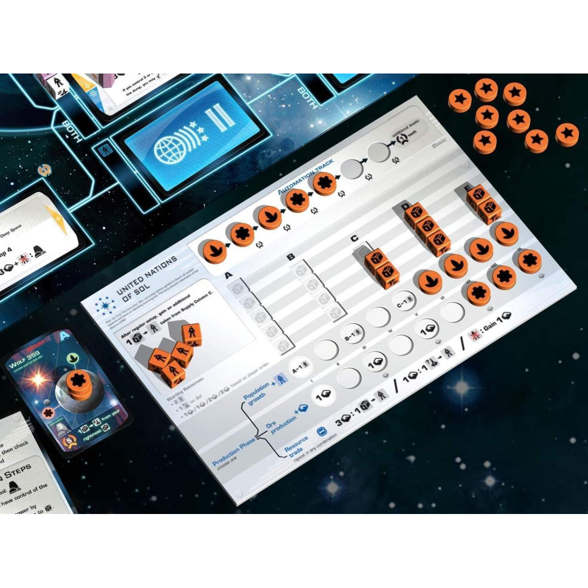 Також у грі ви знайдете набір карт подій, що створює для кожної партії особливі умови, планшет польотів, системи якого доведеться вивчити й колонізувати, і безліч жетонів ресурсів — розпорядіться ними з розумом!
