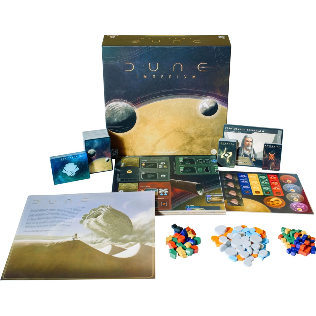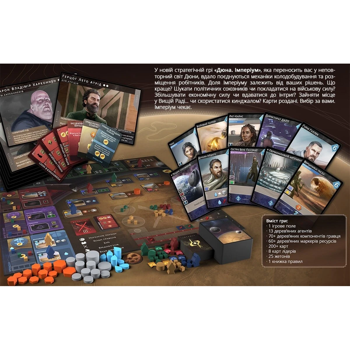 «Dune: Imperium» — стратегічна карткова гра з механіками побудови колоди, розміщення робочих і контролю територій. Гравці постараються взяти під контроль різні фракції Імперіуму — лютих воїнів пустелі Фріменів, сестрицтво Бене Гессерит, гільдію Лоцманів або асамблею Ландсраада, очолювану імператором Шадамом IV з Дому Коріно — і побираються за планету Арракіс, рясні прянощі меланжу. Прянощі — найцінніший ресурс у Імперіумі. Кажуть, що той, хто контролює здобич прянощів, контролює весь всесвіт.