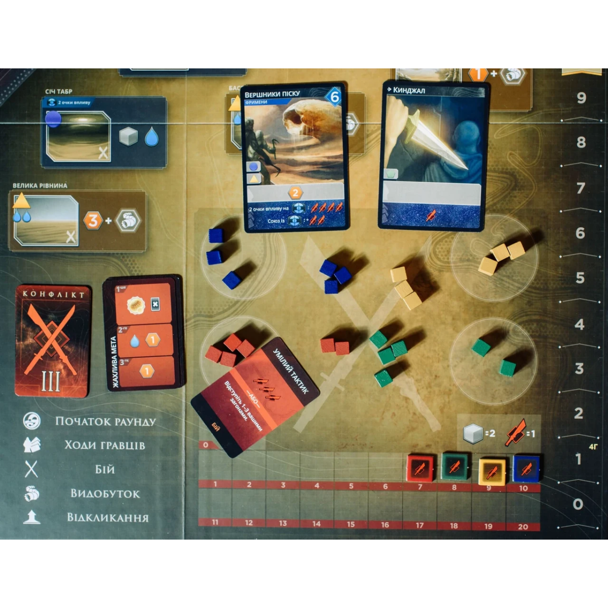 Починаючи з першого гравця, учасники з хоча б 1 кубиком загону в зоні конфлікту можуть по черзі розіграти скільки завгодно таємничих карт бою. Застосувавши ефекти розіграних карток і відкоригувавши силу на шкалі бою, гравці визначають переможців бою. Гравець, який зайняв перше місце за силою, отримує найвищу нагороду з поточної карти конфлікту, а друге місце — другу нагороду. Гравець на третьому місці отримує третю нагороду тільки під час гри вчетверо.
