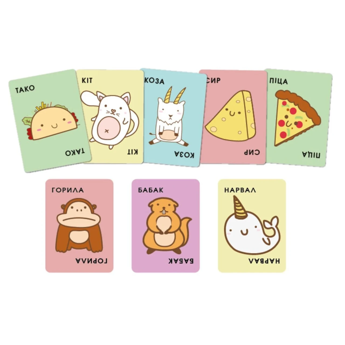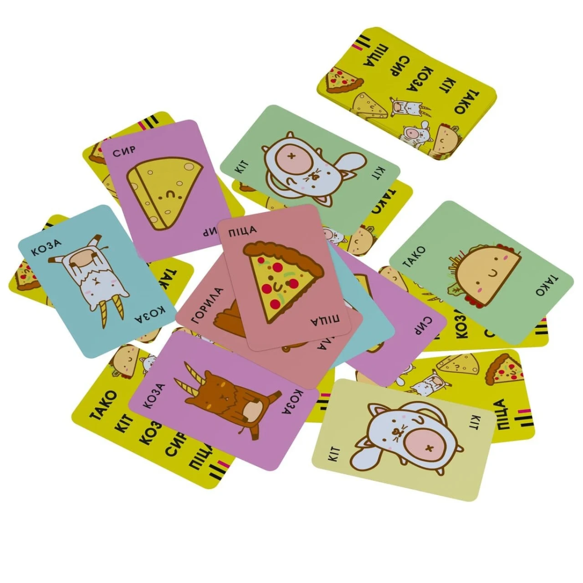 До нас на вечірку може прийти Кіт і Коза, а ще нам можуть привезти Тако або Піццу із Сиром. Якщо сказане слово збігається з малюнком на викладеній мапі, потрібно якнайшвидше накрити викладені картки долонею. Так ми вітаємося з новими гостями або намагаємося ухопити ласий шматочок, поки його не слопали інші.