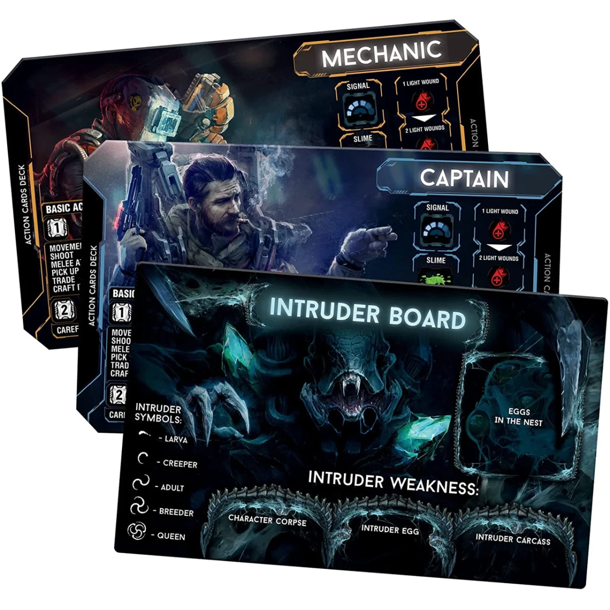 Вибравши персонажа, гравець отримує планшет, мініатюрку та персональну колоду карт. Кожен персонаж унікальний. Наприклад, солдат вміло поливає противника олив“яним дощем. З вченого такий самий боєць, як із чужого хатній улюбленець. Однак він вміє пересуватися, не привертаючи уваги, прекрасно розбирається в системах корабля та вміє виготовляти різні предмети.