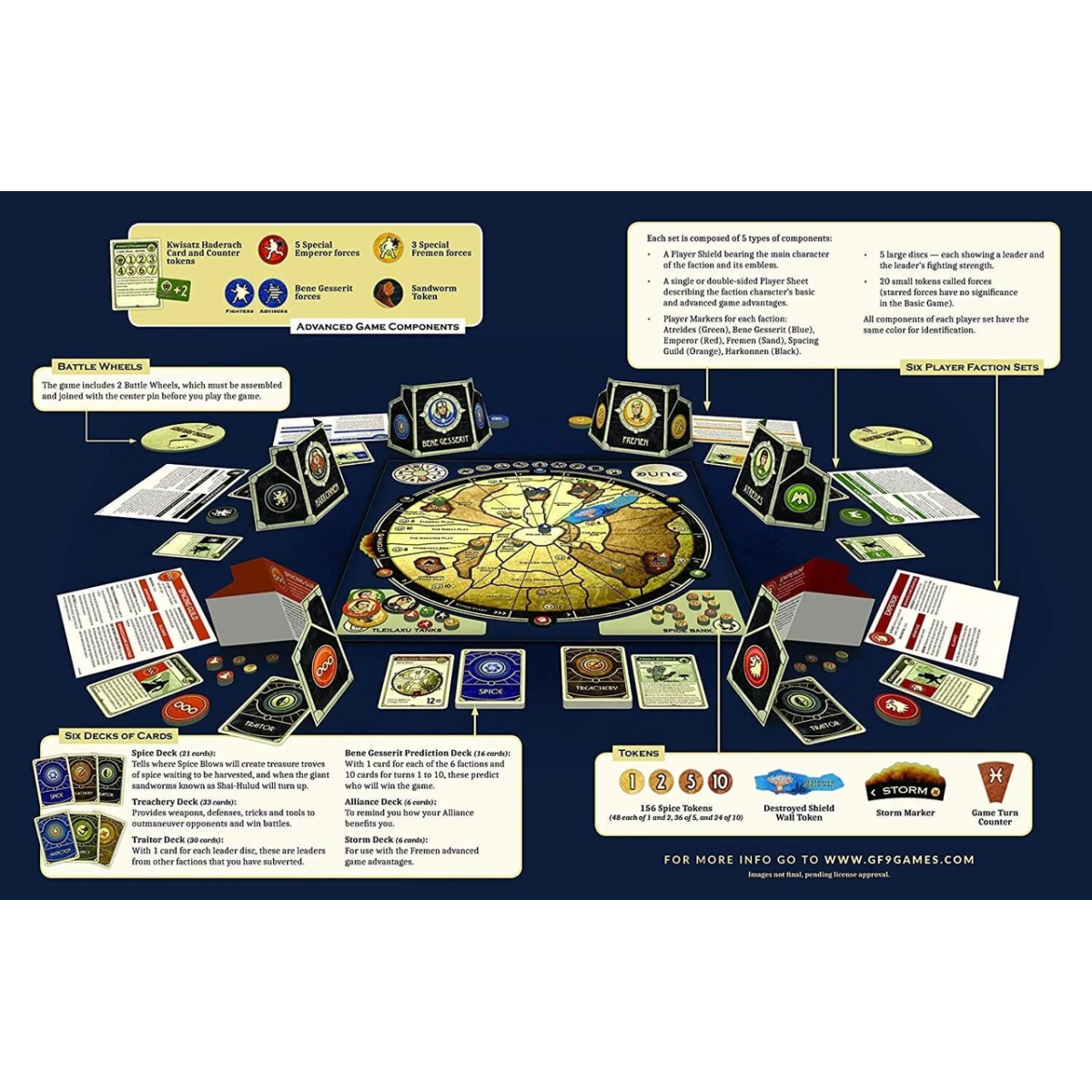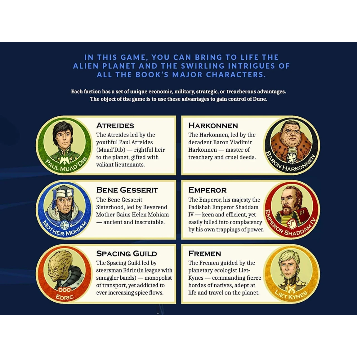 Кожен із учасників бере на себе роль глави благородної сім“ї, яка бажає поширювати свій вплив на Дюну та стати єдиним постачальником меланжу. Протиборювальні сторони мають унікальні війська, стратегія й можливості, не доступні іншим родинам. Асиметричність ігрового процесу дає змогу учасникам випробувати різні тактики, граючи за різні фракції від партії до партії.