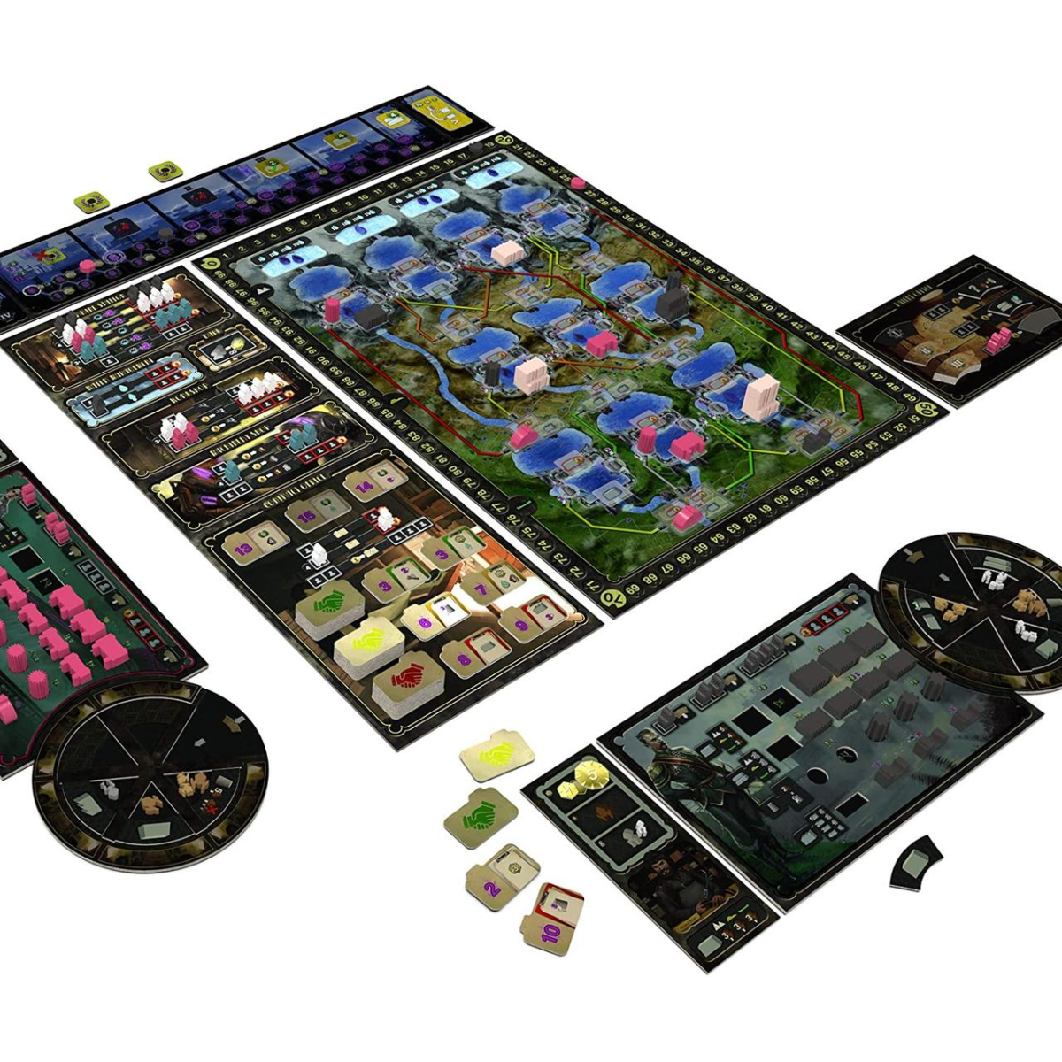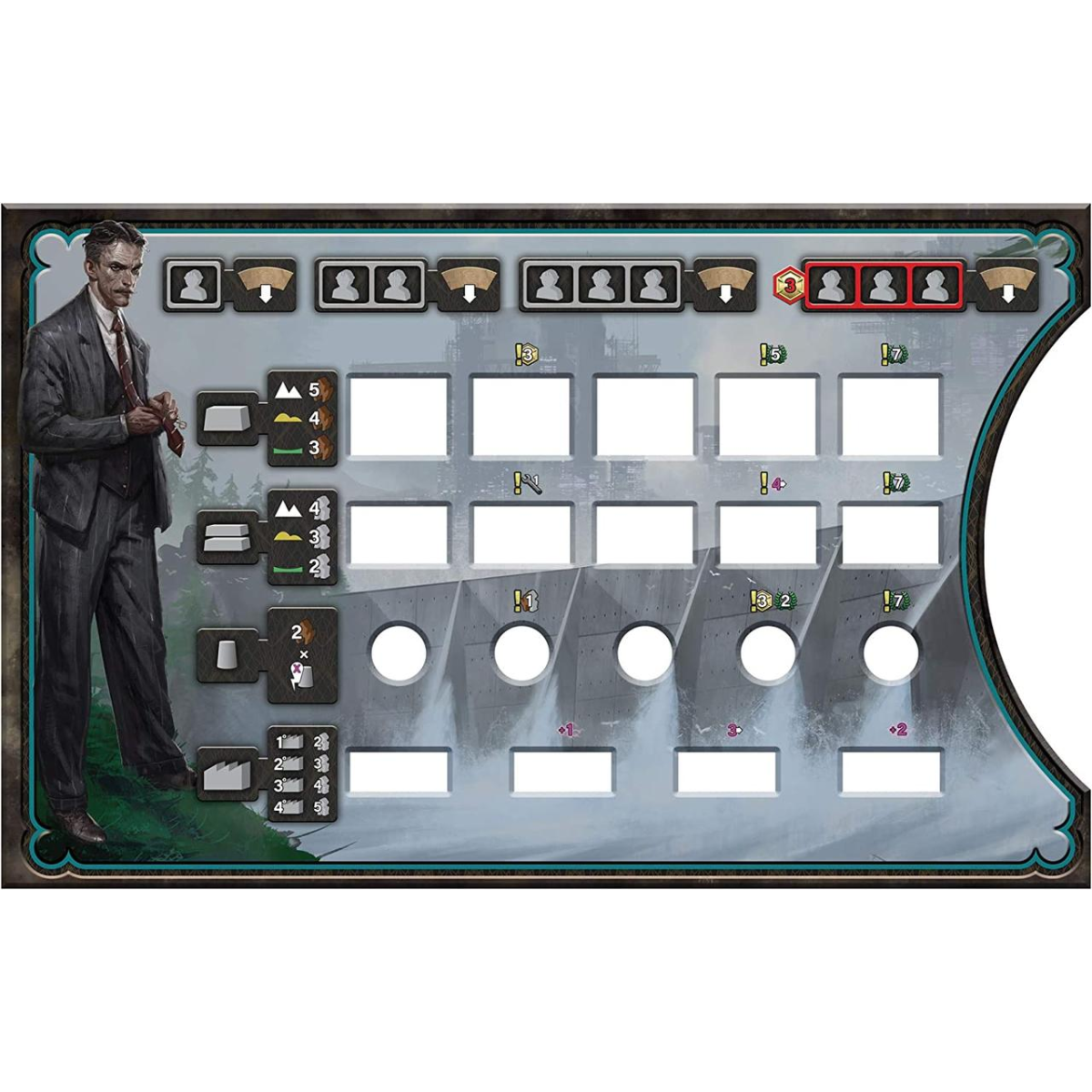 В зоні водозабезпечення можна виконати дію, щоб додати краплі води на жетони коренів річок. У банці можна взяти грошовий кредит за кількістю розміщуваних інженерів. У майстерні можна повернути своє колесо будівництва на кілька секторів і забрати жетони технологій і техніку з відкривними секторами.
