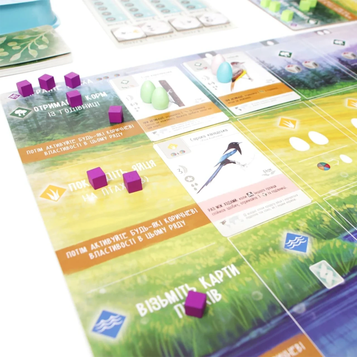 Викладає карту птаха з руки на свій планшет, займаючи першу (зліва направо) незайняту клітинку у вибраному рядку. На карті птаха вказується ареал проживання (тобто допустимий рядок на планшеті - ліс, степ, болото) і необхідний корм. Фішка дій розміщується над відповідним стовпцем. Там же зазначено, скільки яєць треба віддати за розміщення.