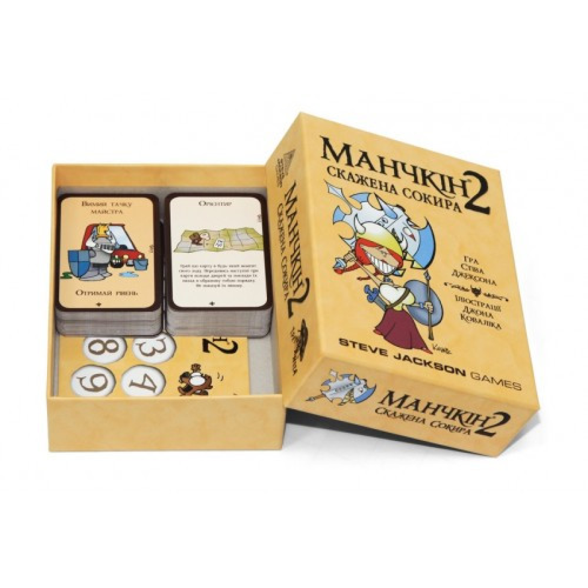 Манчкін 2 Скажена Сокира - доповнення, яке містить 112 нових карт Дверей та Скарбів, українське видання доповнення Munchkin 2: Unnatural Axe.