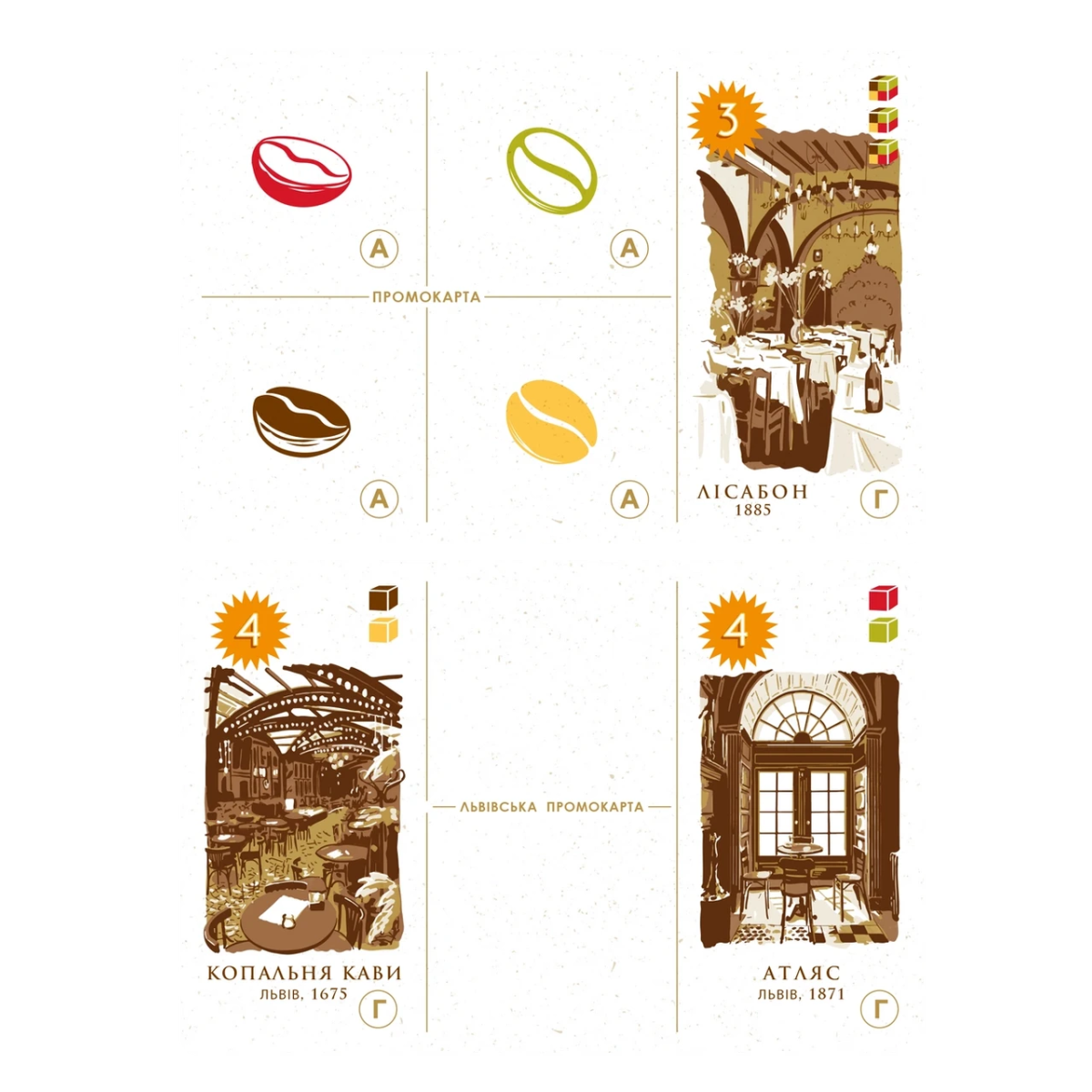 Настільна гра «Кава» включає стандартний, розширений та соло-варіант гри, а також розширення «Еспресо». Приємним бонусом у наборі гри є карти з зображенням Львівської Копальні кави, та знаменитої кав“ярні «Атляс».