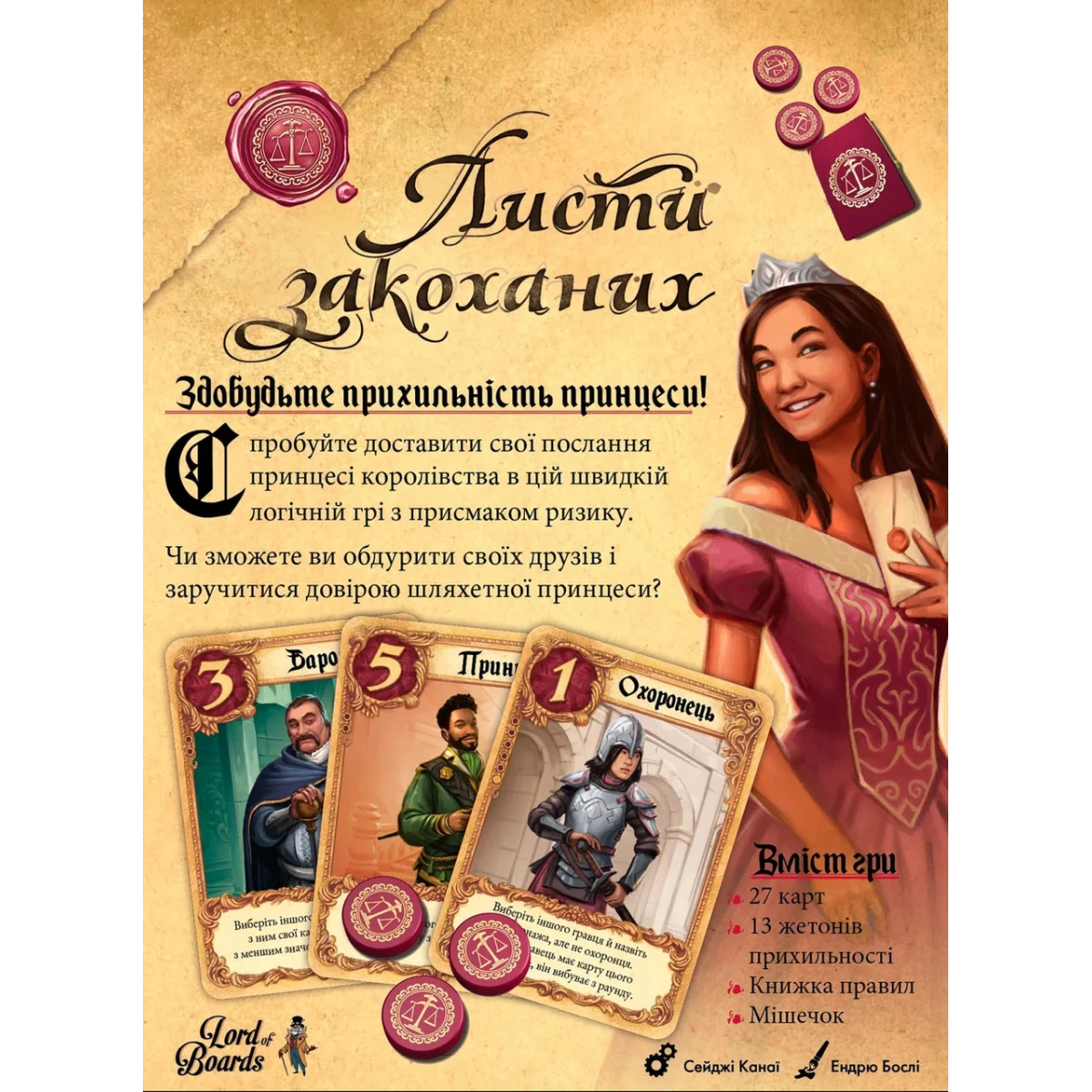 У грі використовується лише шістнадцять карт із зображеннями персонажів, що мешкають в палаці. Число на карі характеризує вплив персонажа - що більший, то більше шансів, що саме цей персонаж принесе перемогу, передавши послання сумній принцесі. На картах персонажів також указані унікальні здібності, які стануть у пригоді під час гри.