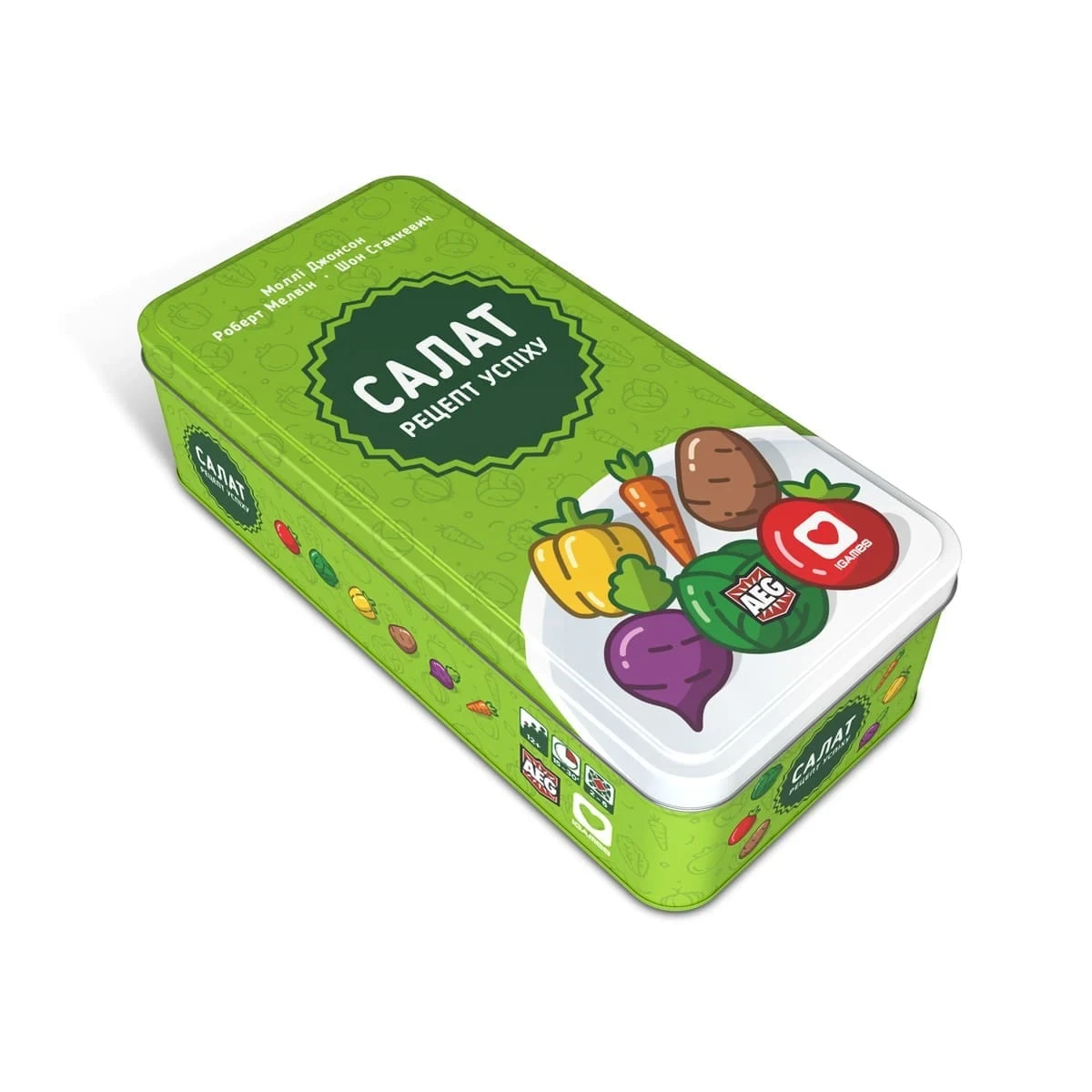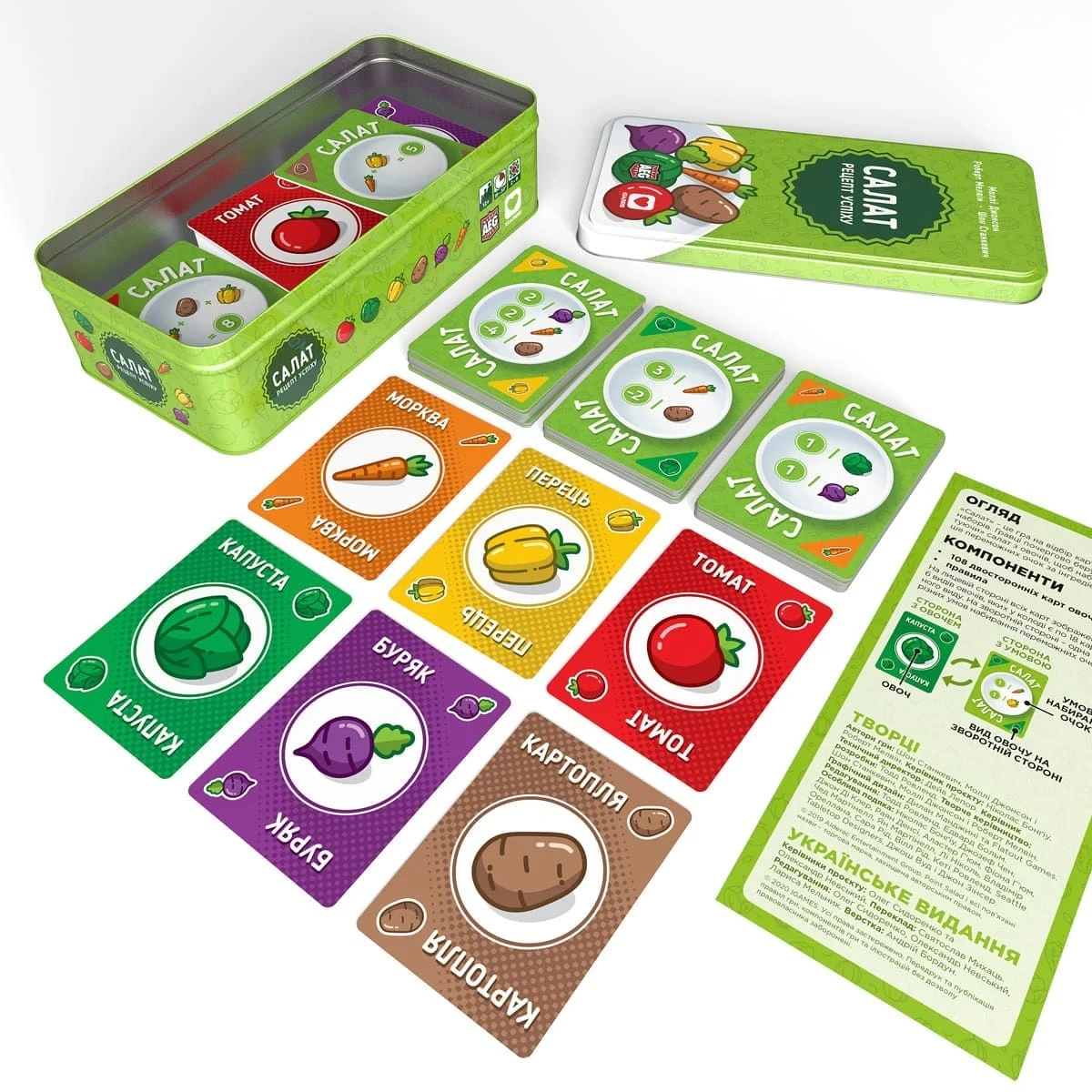 Салат Рецепт Успіху – це проста карткова настільна гра з яскравими картинками на збір сетів. Гра захоплива як для двох учасників, так і для шести. А прості правила дозволять приєднатися до створення салатів гравців будь-якого досвіду в настільних іграх!
