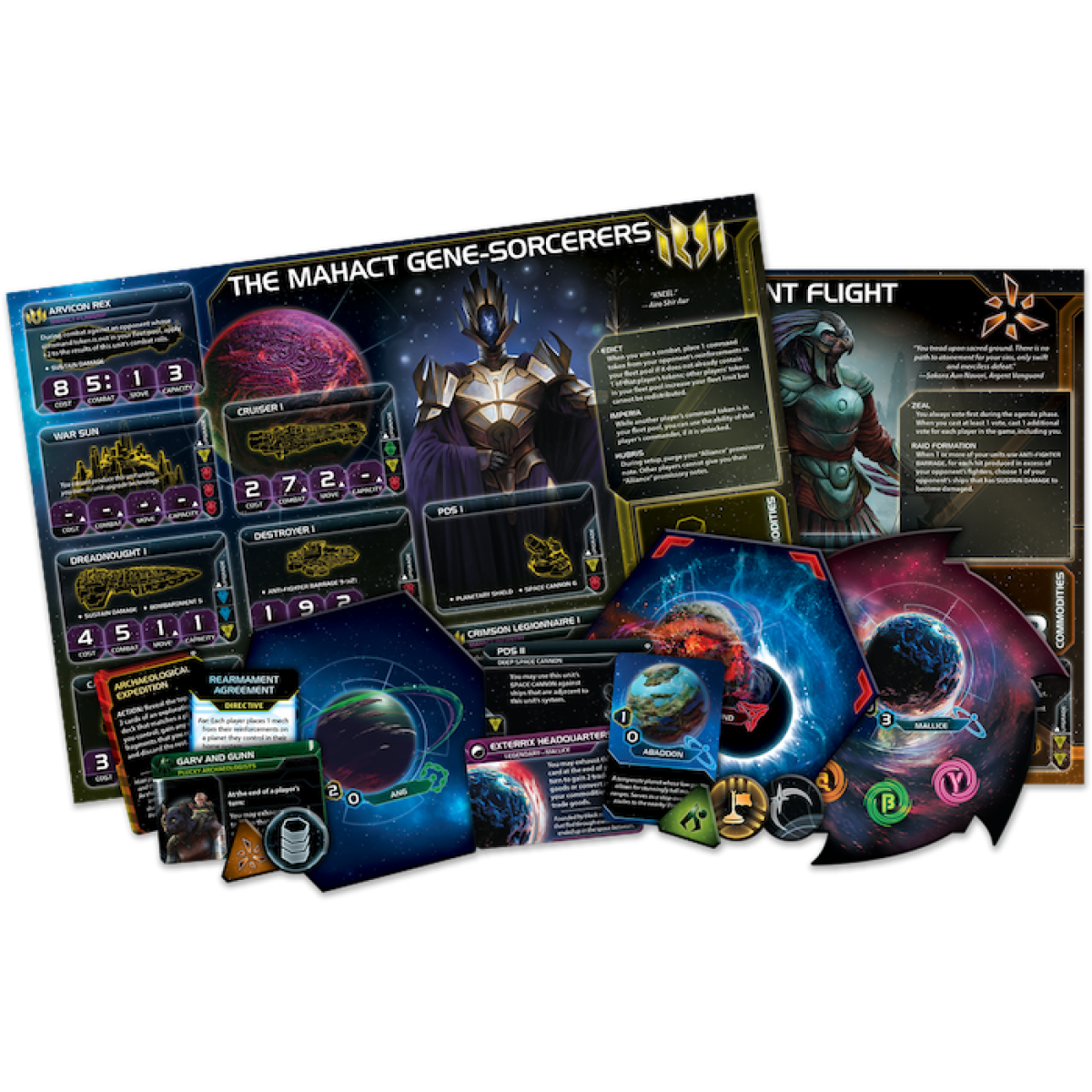 Це масштабне розширення наповнене новим контентом, який ви можете додати у свої ігри Twilight Imperium. Галактика стала набагато більшою, оскільки в гру увійшли сім фракцій, що раніше не зустрічалися, кожна з яких може похвалитися своїми унікальними сильними і слабкими сторонами: від генно-змінних здібностей Махакта до пильної варти Срібного польоту і загадкових і давні Емпіреї. І нові фракції — не єдиний спосіб, за допомогою якого галактика стає більшою! Сорок нових плиток систем та гіперліній додають на карту нові планети та перешкоди, а завдяки двом новим кольорам компонентів гравців, включеним у розширення Prophecy of Kings, ви можете грати у Twilight Imperium за участю до восьми гравців».