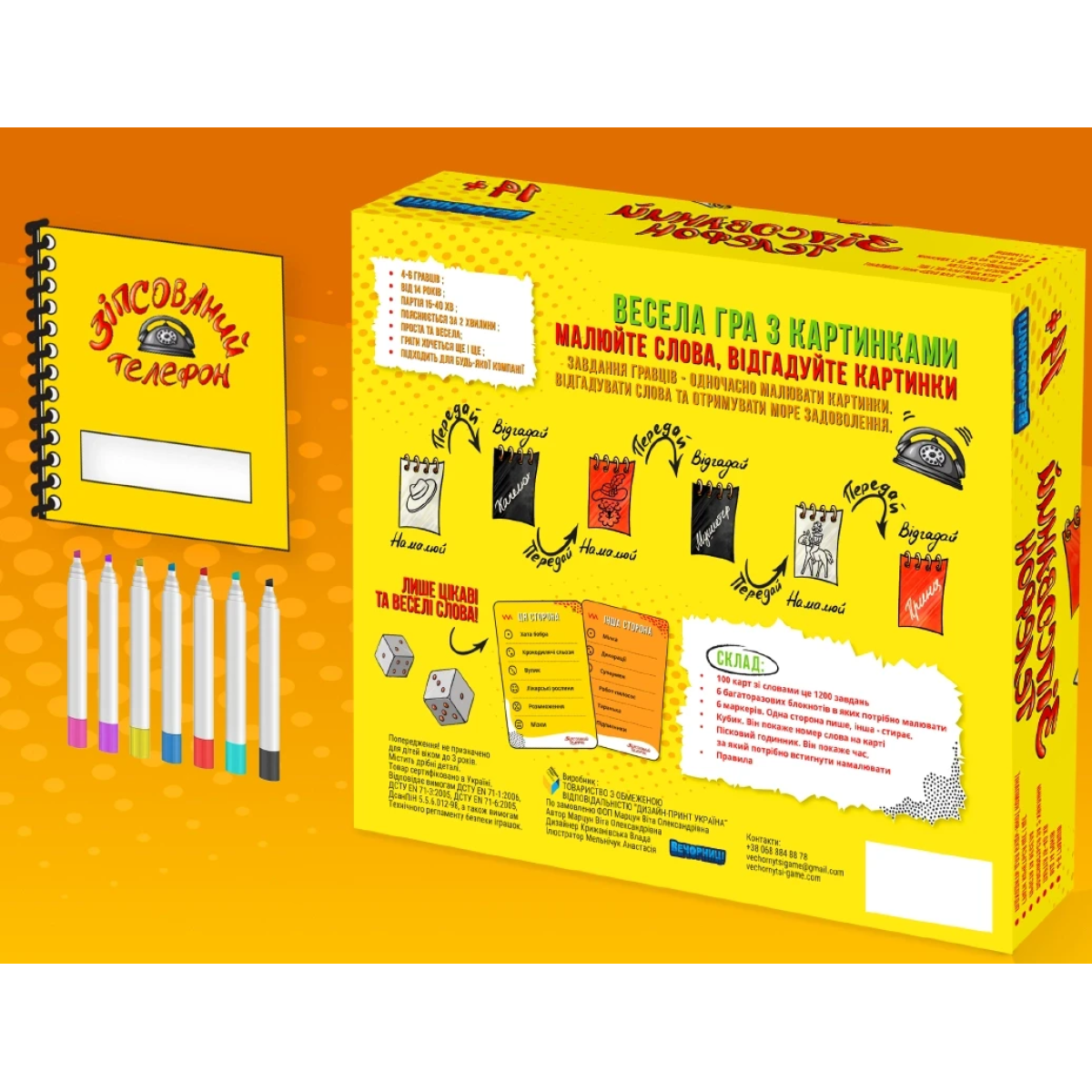 В комплекті зручні багаторазові блокноти та маркери, а також пісковий годинник для відліку часу. Гра «Зіпсований телефон» підходить для різновікової компанії; для людей, які вміють або не вміють малювати; для всіх, хто любить нестандартні ігри на відгадування слів.
