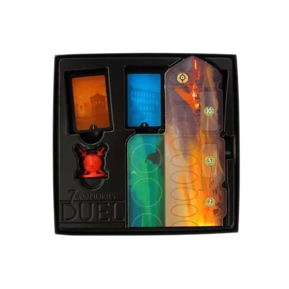Гра 7 Wonders: Duel розрахована на двох гравців. Оформлення й атмосфера гри не змінилися — все та ж гра 7 Wonders, але механіка зазнала змін. Відчувається, що з усієї серії взято все найкраще та з усім цим ще попрацював Катала — жетони бонусів і картки з різними сорочками. Якщо ви грали в 7 Wonders, то компоненти вам будуть дуже знайомі. У компонентах нововведень трохи — жетони прогресу, поле для позначки військового переваги та фішка, яка покликана зазначати баланс військових сил.