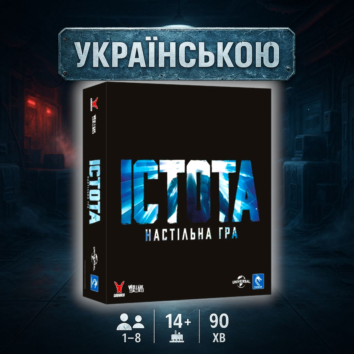 Ізольована полярна станція. Завірюха, що змінюється відносним штилем. Обмежені ресурси й харчі. І серед вас - позаземна Істота без форми, що може приймати вигляд будь-якого живого організму, хоч тварини, а хоч і людини. Настільна гра «Істота» запрошує вас випробувати свою стійкість у пригоді за мотивами фільму Джона Карпентера «The Thing» 1982-го року: протриматися до прибуття гелікоптера, вибратися із захопленої невідомою почварою станції та примудритися не забрати її з собою до великого світу!