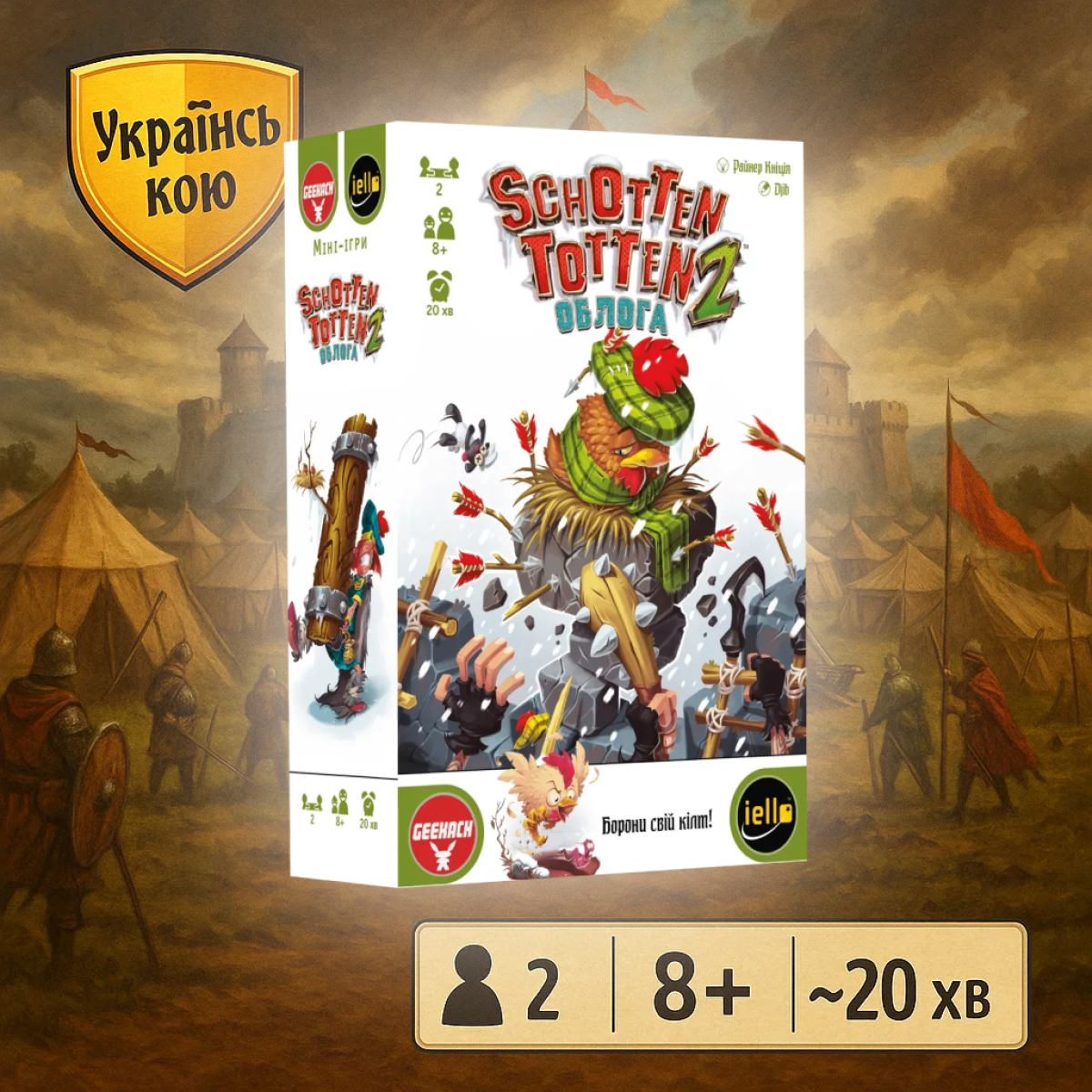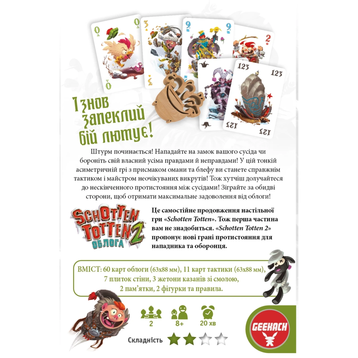 «Schotten Totten 2» - хитрий дуельний філлер про облогу замку на складання карткових комбінацій («set collection») з елементами контролю територій («area control»). Один гравець командує облоговою армією, а його опонент керує обороною замку. У противників асиметричні цілі та свої власні переможні умови.