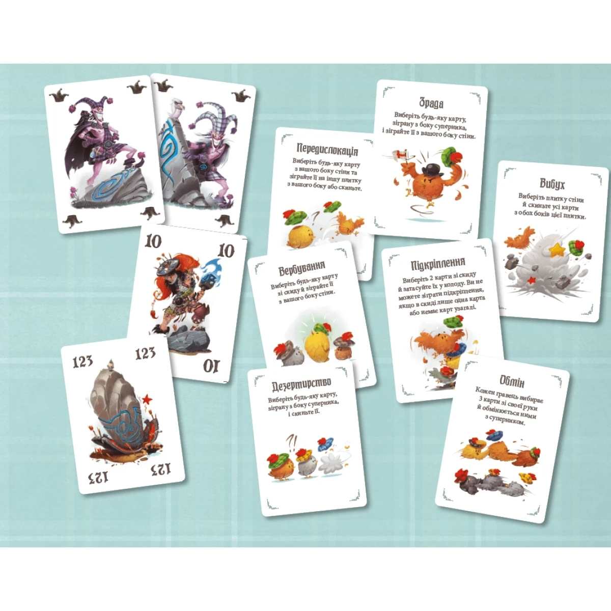 Карта з силою «0» вибиває карту «11» того самого кольору на іншому боці стіни, а карта «11» – «0» того самого кольору.