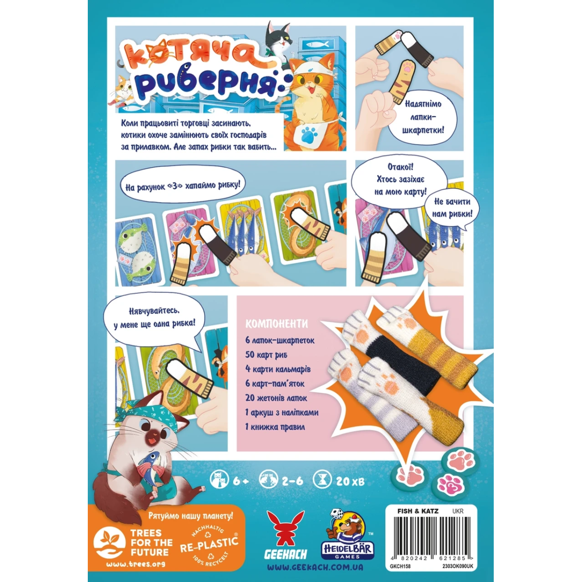 Завжди заздрили котикам та хотіли спробувати побути хоча б день у їхній ролі? Гра на спритність «Котяча риберня» (Fish & Katz) — це відповідь на ваші мрії. У вас з“являться пухнасті лапки, палке бажання поласувати смачненькою рибиною та позмагатись з іншими муркотиками у швидкості.Ваша головна ціль стати першим, хто поклав лапку (вказівний палець у шкарпетці-лапці) на підхожу для збору сетів карти рибки. Сет з трьох однакових рибин принесе вам переможні бали у вигляді жетонів лапок. Відповідно, переможцем стає той, хто зібрав найбільшу кількість балів. Хіба не милота?