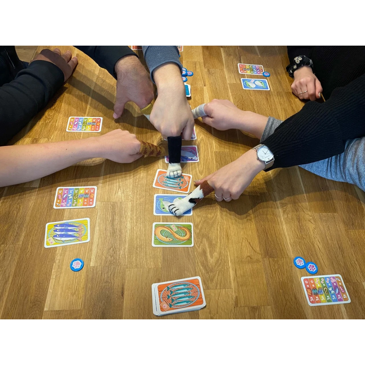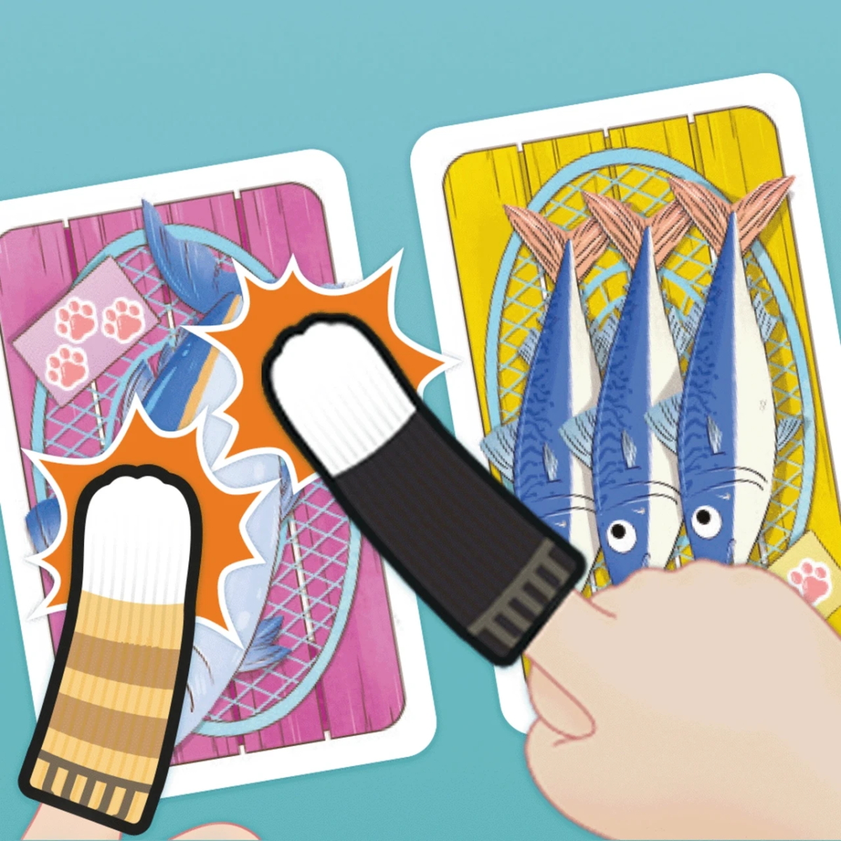 Учасники візуально обирають карти рибок для себе, після чого на рахунок три накривають своїм пальцем обрані картки. Якщо хтось з котиків поклав лапку пізніше за інших, тоді він залишається без бажаного смаколика. Всі учасники повинні торкнутись карток водночас.