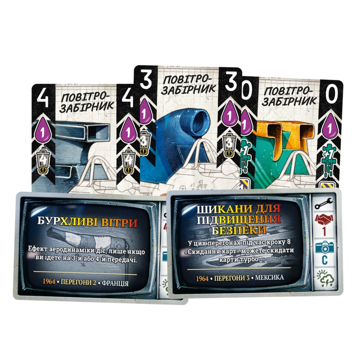 Доповнення «Дощі та грози» додає серед іншого нові поліпшення, два нових треки та компоненти для сьомого гравця. Карти стресу, турбо, спонсорів, поліпшень та подій замішуються до відповідних базових колод.