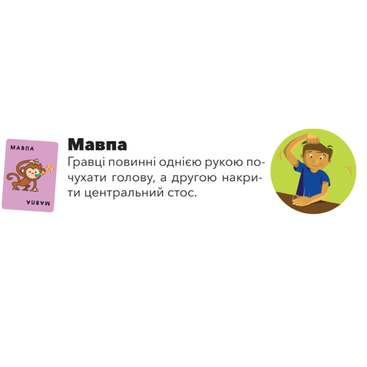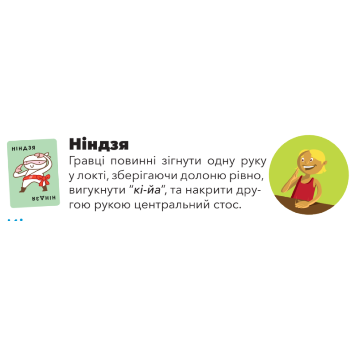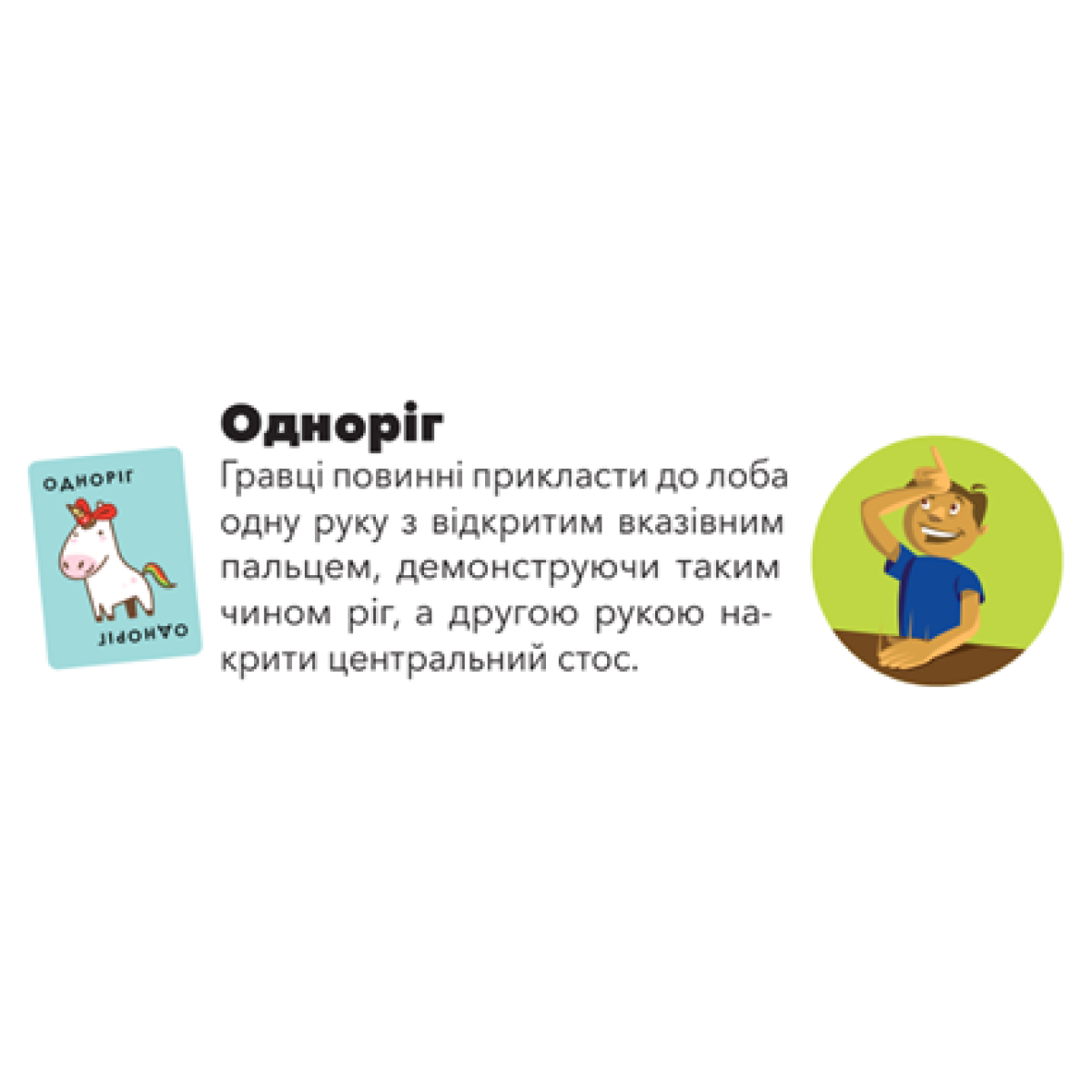 Якщо вам попалася карта мавпочки, потрібно якнайшвидше почухати рукою голову, а другою накрити центральну колоду. Єдиноріг просить зобразити його казковий ріг вказівним пальцем, а ніндзя хоче, щоб ви зігнули одну руку в лікті, неодмінно з прямою лодошкою, і голосно крикнули: “Кі-йя“. При цьому, звичайно, другою рукою теж потрібно накрити стопку з картами.