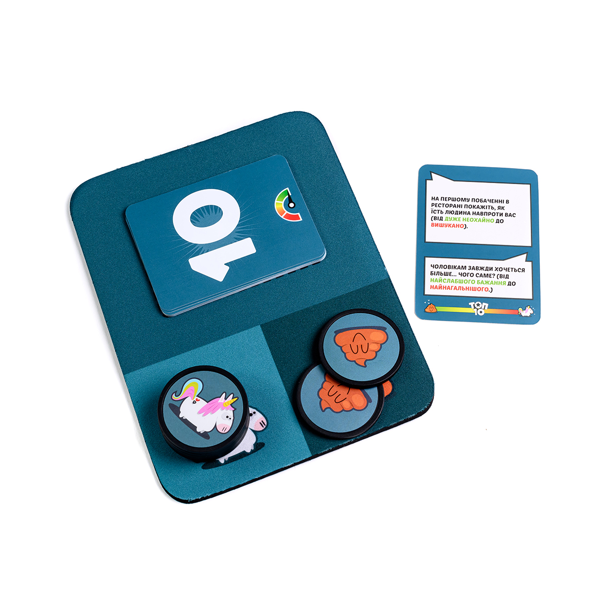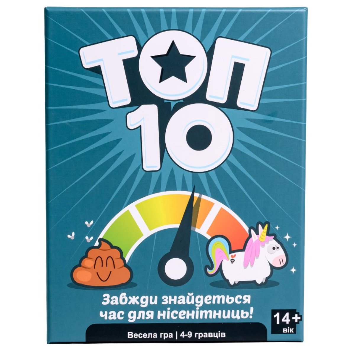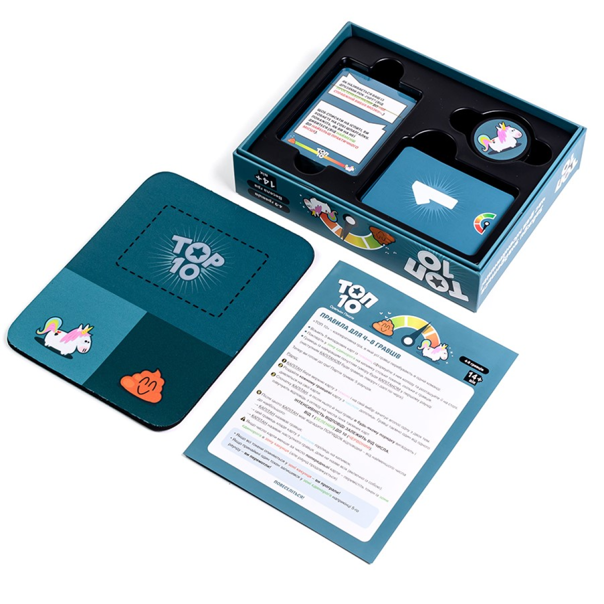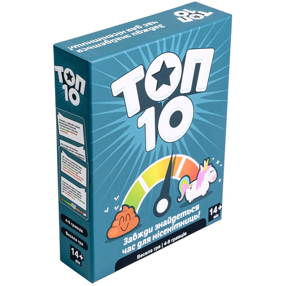 “Топ 10“ — це весела кооперативна настільна гра, в якій гравці відповідають на незвичайні та смішні запитання, а потім намагаються правильно розташувати відповіді за шкалою від 1 до 10. Гра ідеально підходить для вечірок та дружніх зустрічей, адже вона стимулює уяву, викликає чимало сміху та допомагає краще пізнати одне одного.
