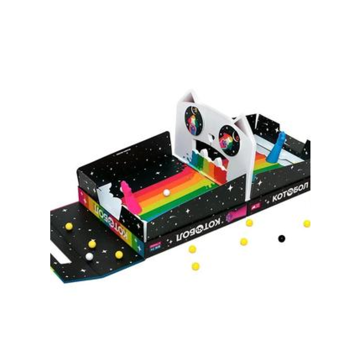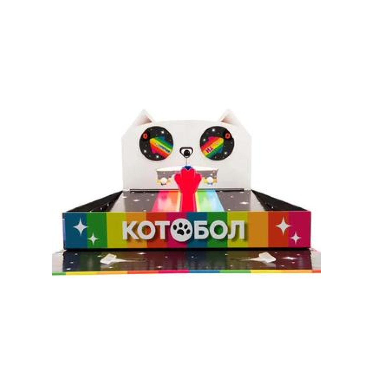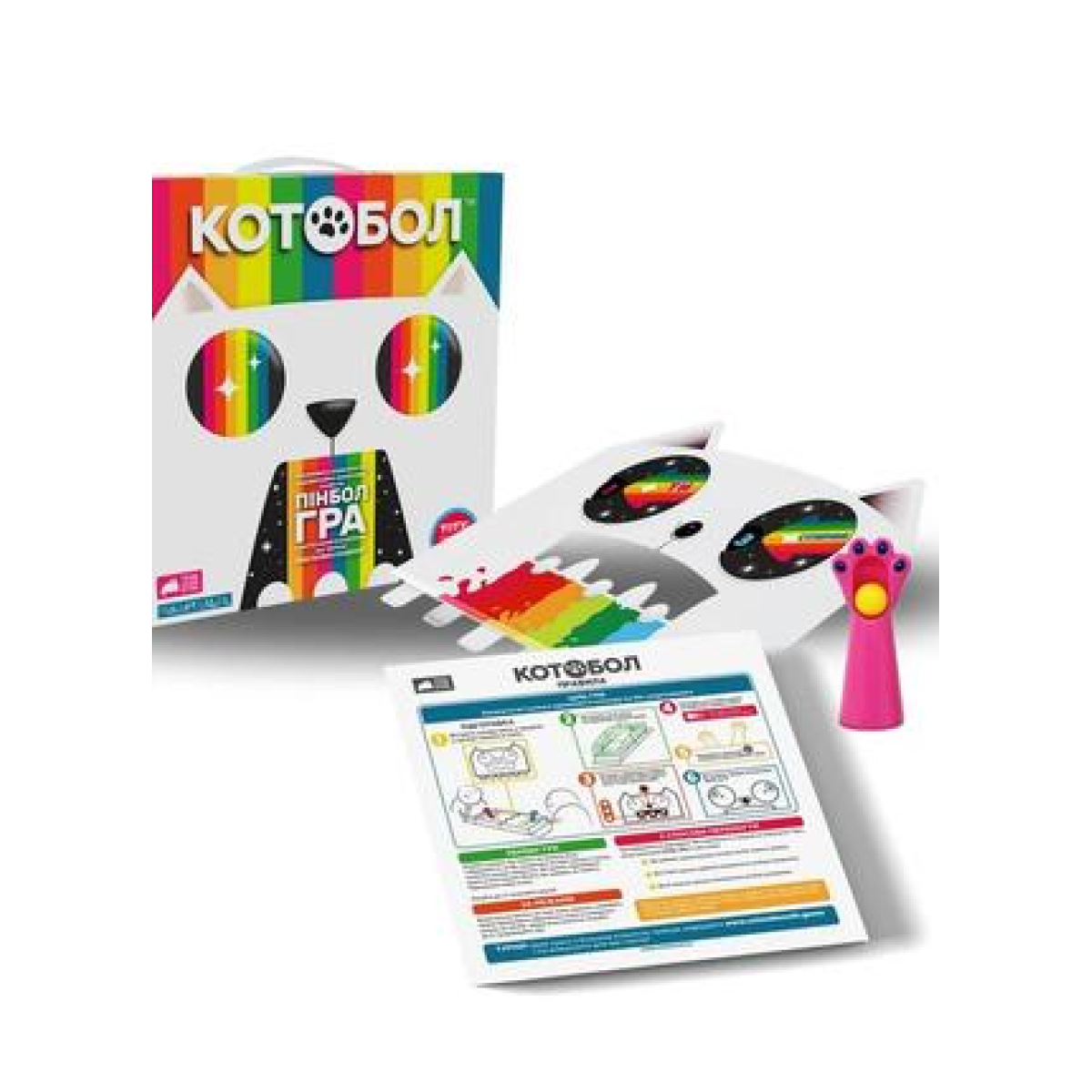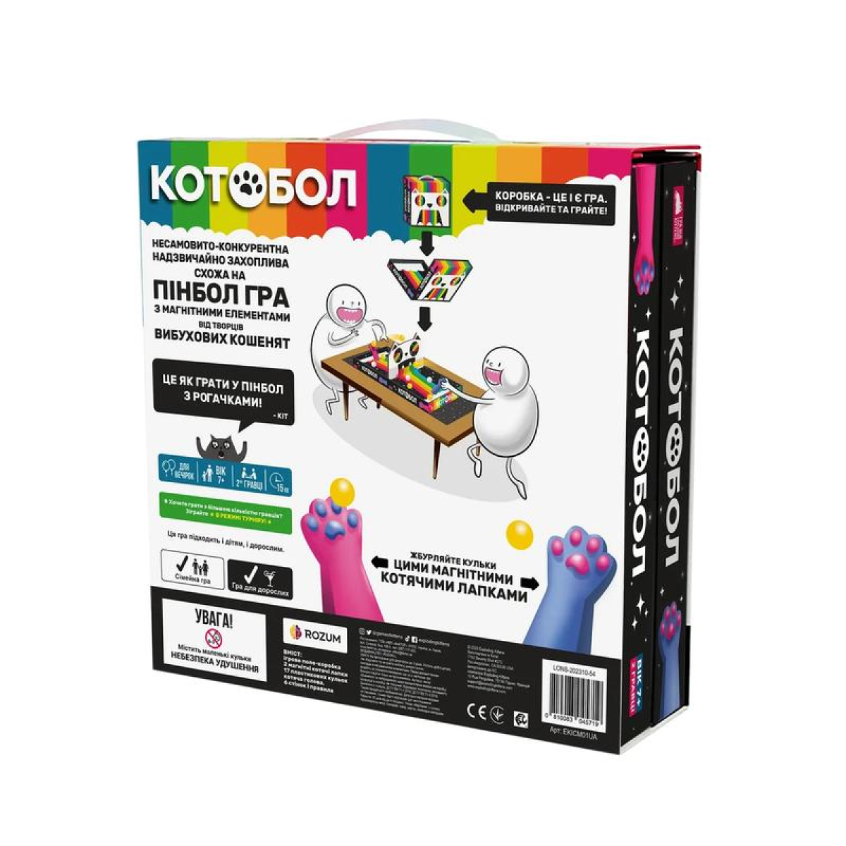 Котобол (A Game of Cat & Mouth) — це динамічна і весела настільна гра для двох гравців, яка поєднує в собі елементи пінболу та спортивного змагання. У цій грі ви змагаєтеся, використовуючи катапульти у вигляді котячих лап, щоб запускати різнокольорові кульки через рот великого кота, зображеного на вертикальному ігровому полі.