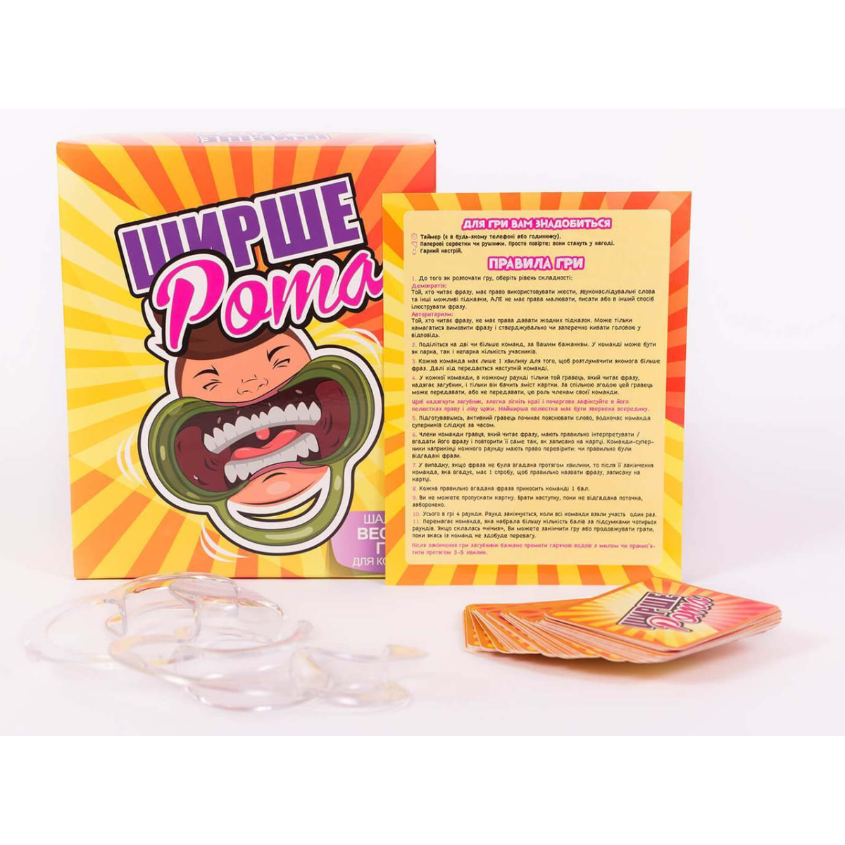 Шире Рот / Ширше Рота — це весела та захоплююча настільна гра, яка ідеально підходить для дружніх зустрічей і вечірок. Гра ґрунтується на комунікації та асоціаціях, де гравці повинні описувати і відгадувати слова, фрази або об“єкти, не використовуючи їх безпосередньо.