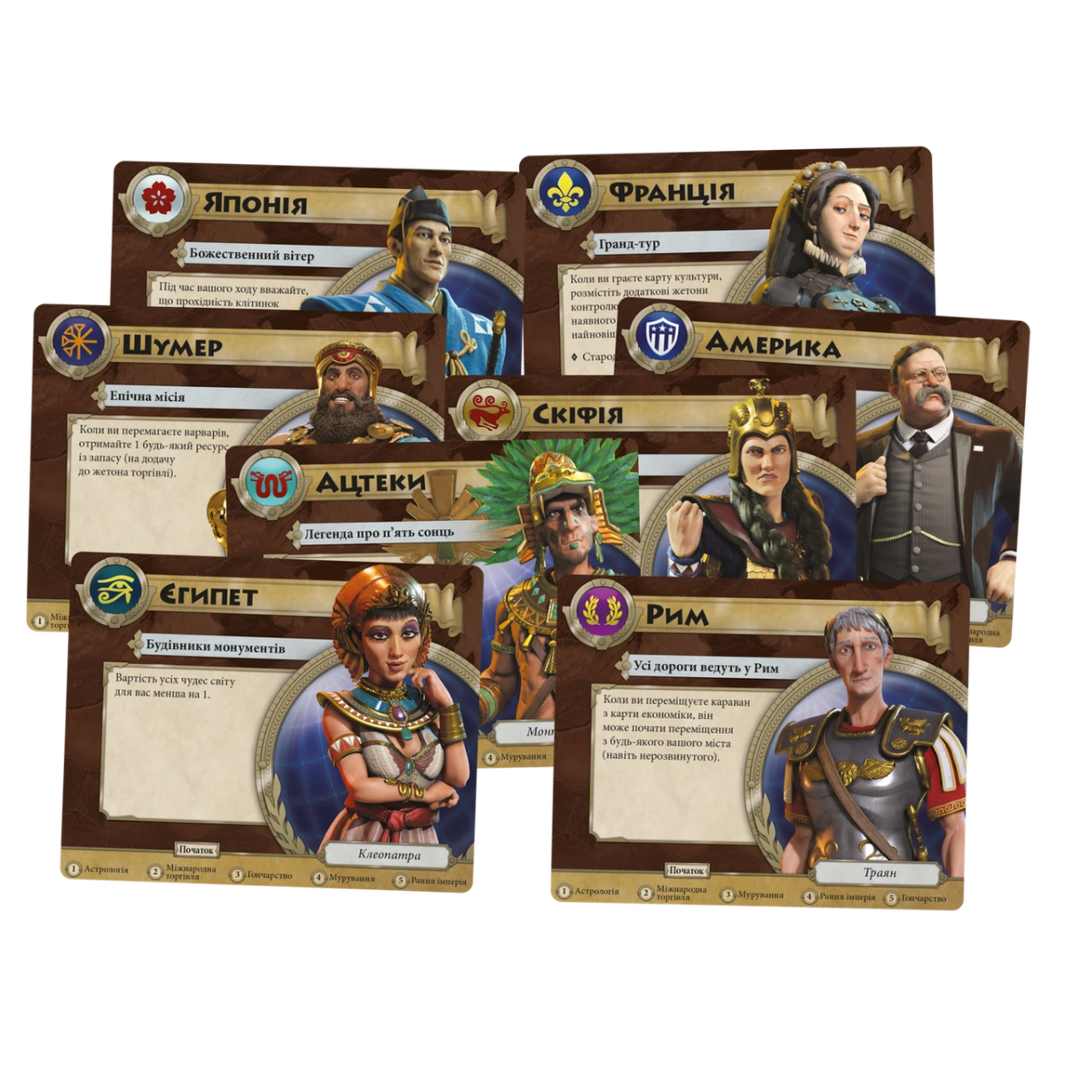 24 Карти Лідерів: Карти, які представляють різних лідерів цивілізацій з унікальними можливостями.