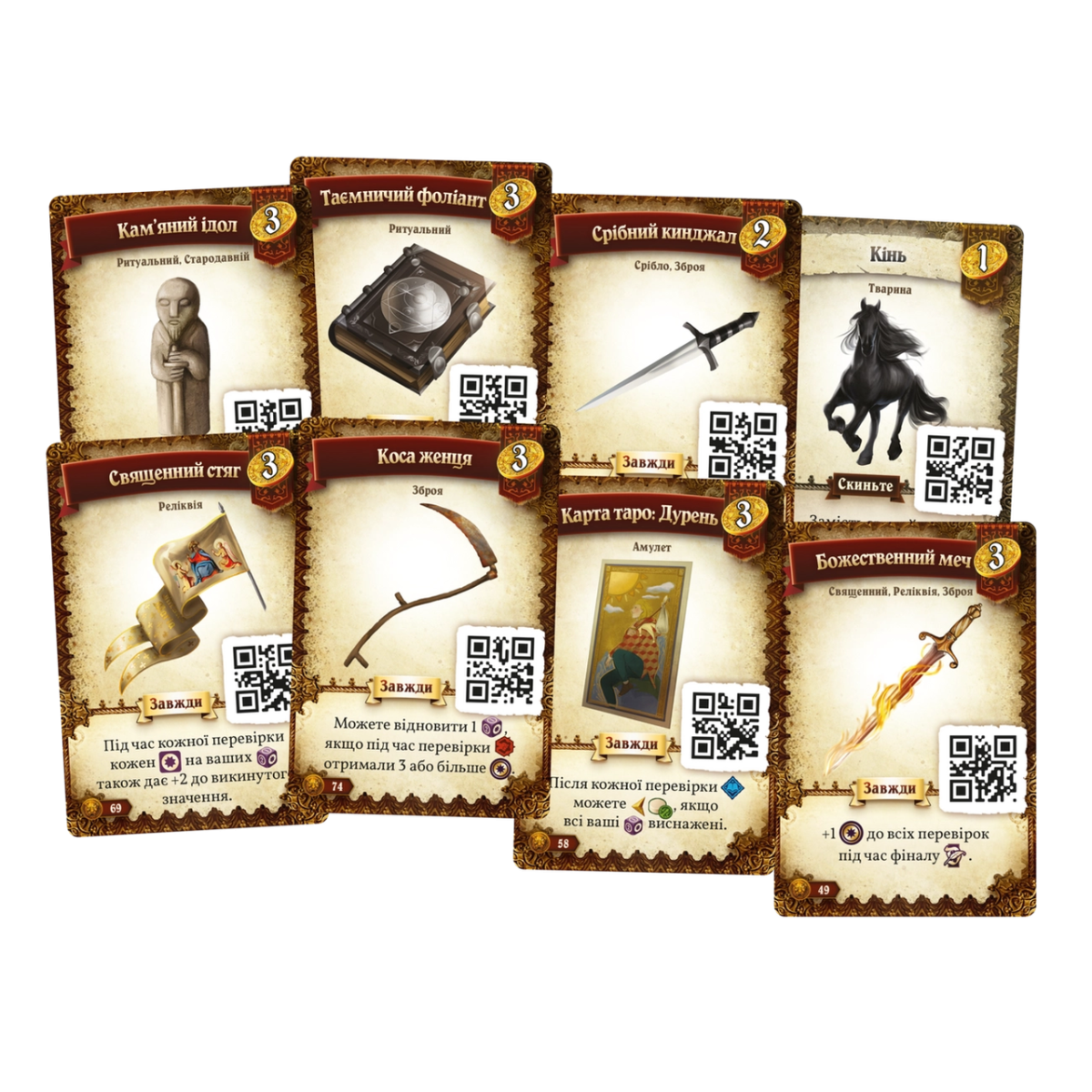 60 Карток предметів: Карти з предметами, які можна використовувати для вирішення завдань та покращення персонажів.