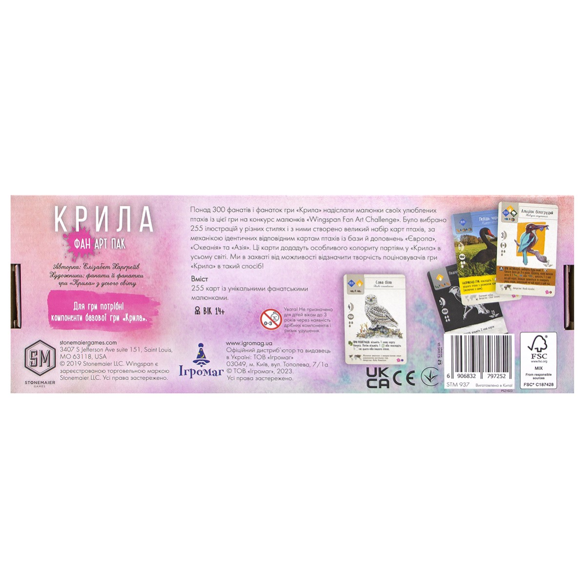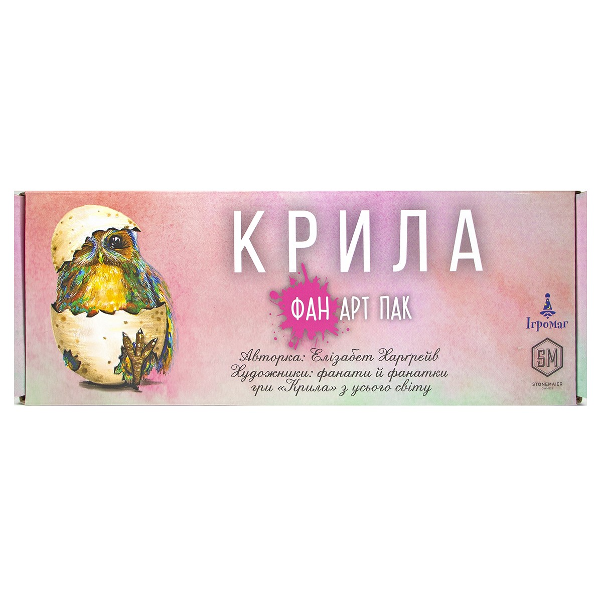 Опис гри: “Крила: Фан Арт Пак“ — це додатковий набір карт для настільної гри “Крила“ (Wingspan), створеної Елізабет Гарґрейв, що здобула величезну популярність серед шанувальників настільних ігор. “Крила“ — це стратегічна настільна гра, у якій гравці виступають у ролі орнітологів, керуючи заповідниками птахів. Додаток “Фан Арт Пак“ включає карти, створені фанатами гри, що надає їй нових естетичних елементів та унікальних ілюстрацій.