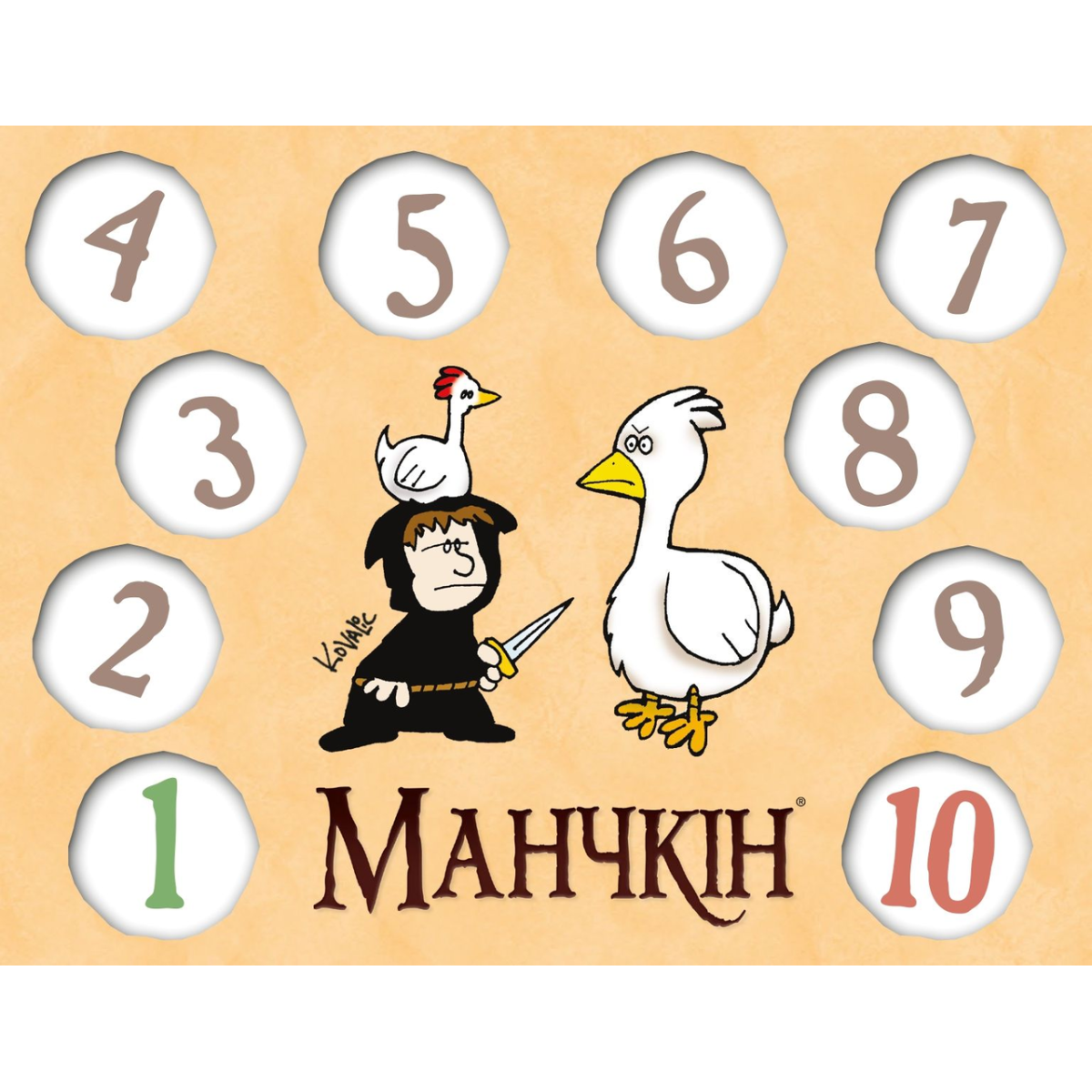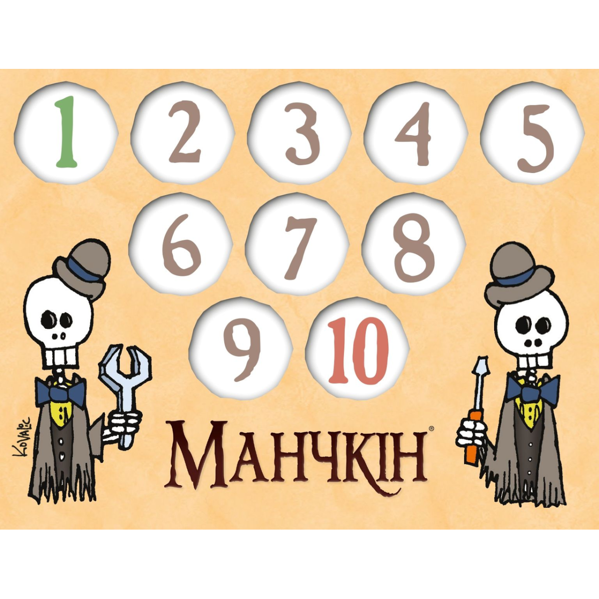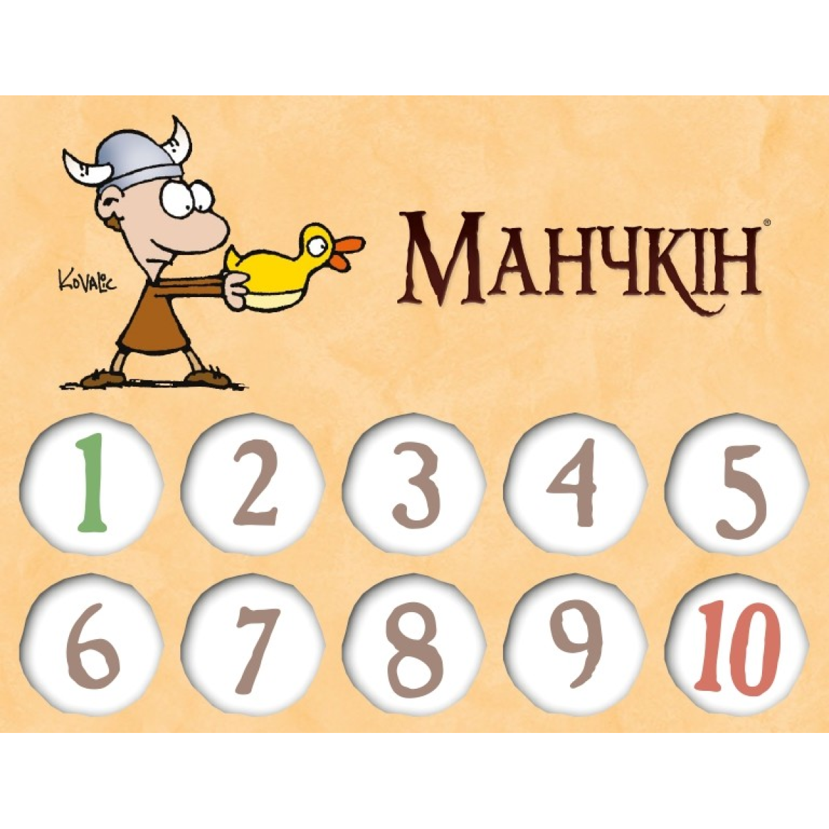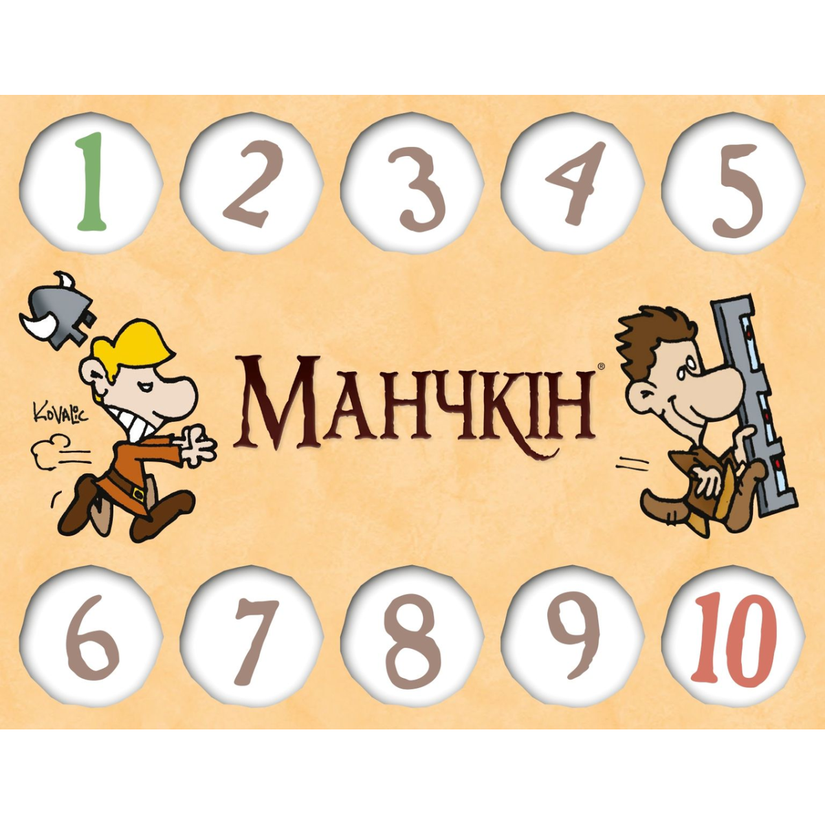 6 двосторонніх лічильників рівнів – вони виготовлені з щільного картону і мають зручну форму. Кожен лічильник представляє собою диск, який можна обертати, щоб зазначати рівень від 1 до 10. На кожній стороні диска зображені різні герої або тематичні елементи з світу Манчкіна.