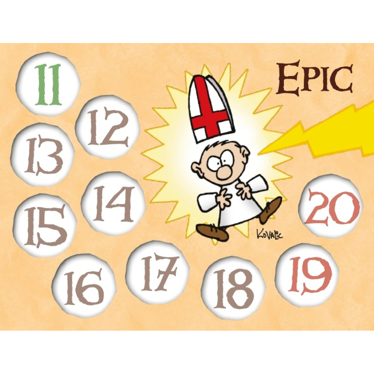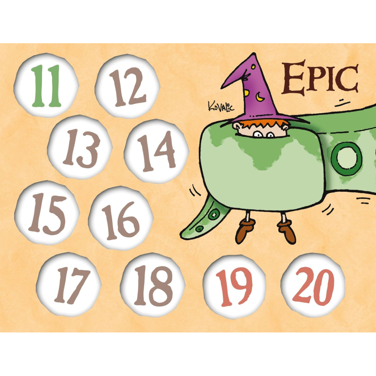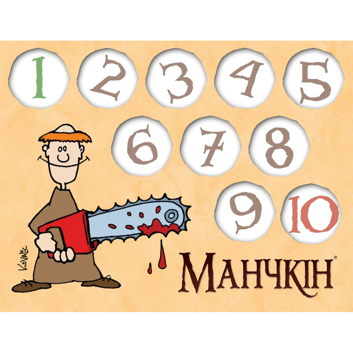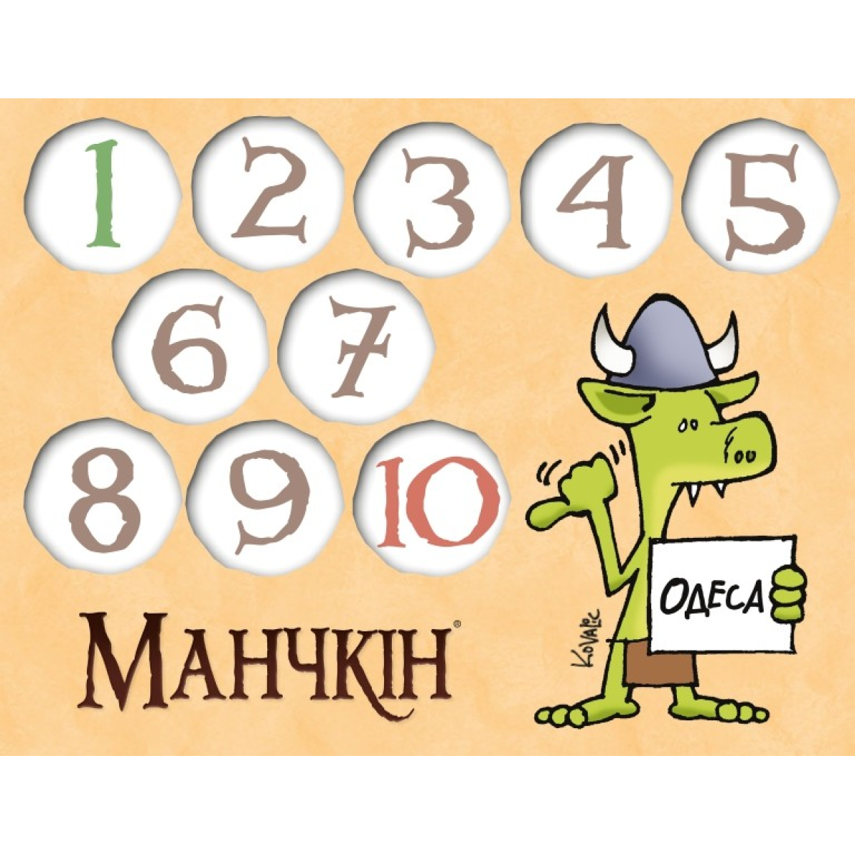 6 двосторонніх лічильників рівнів – вони виготовлені з щільного картону і мають зручну форму. Кожен лічильник представляє собою диск, який можна обертати, щоб зазначати рівень від 1 до 10. На кожній стороні диска зображені різні герої або тематичні елементи з світу Манчкіна.