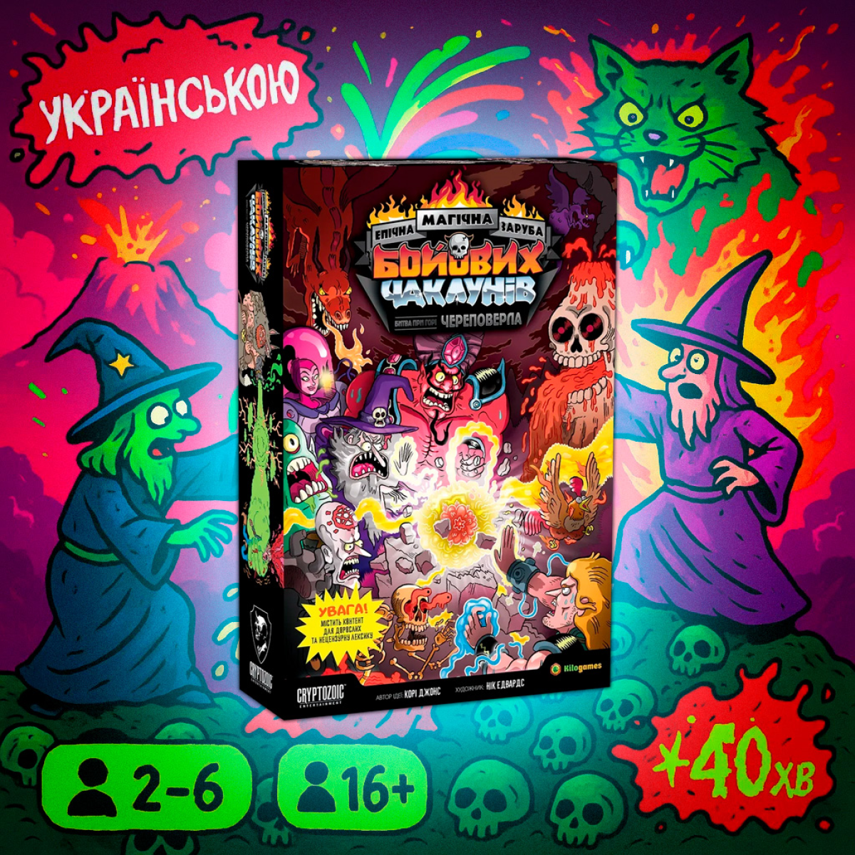 Опис: “Епічна Магічна Заруба Бойових Чаклунів“ — це захоплююча карткова гра, сповнена гумору, хаосу та епічних магічних битв. Гравці виступають у ролі могутніх бойових чаклунів, які змагаються на легендарній горі Череповерла, використовуючи потужні заклинання, щоб знищити своїх суперників. Гра привертає увагу своїм нестандартним стилем, яскравими ілюстраціями та динамічним ігровим процесом.
