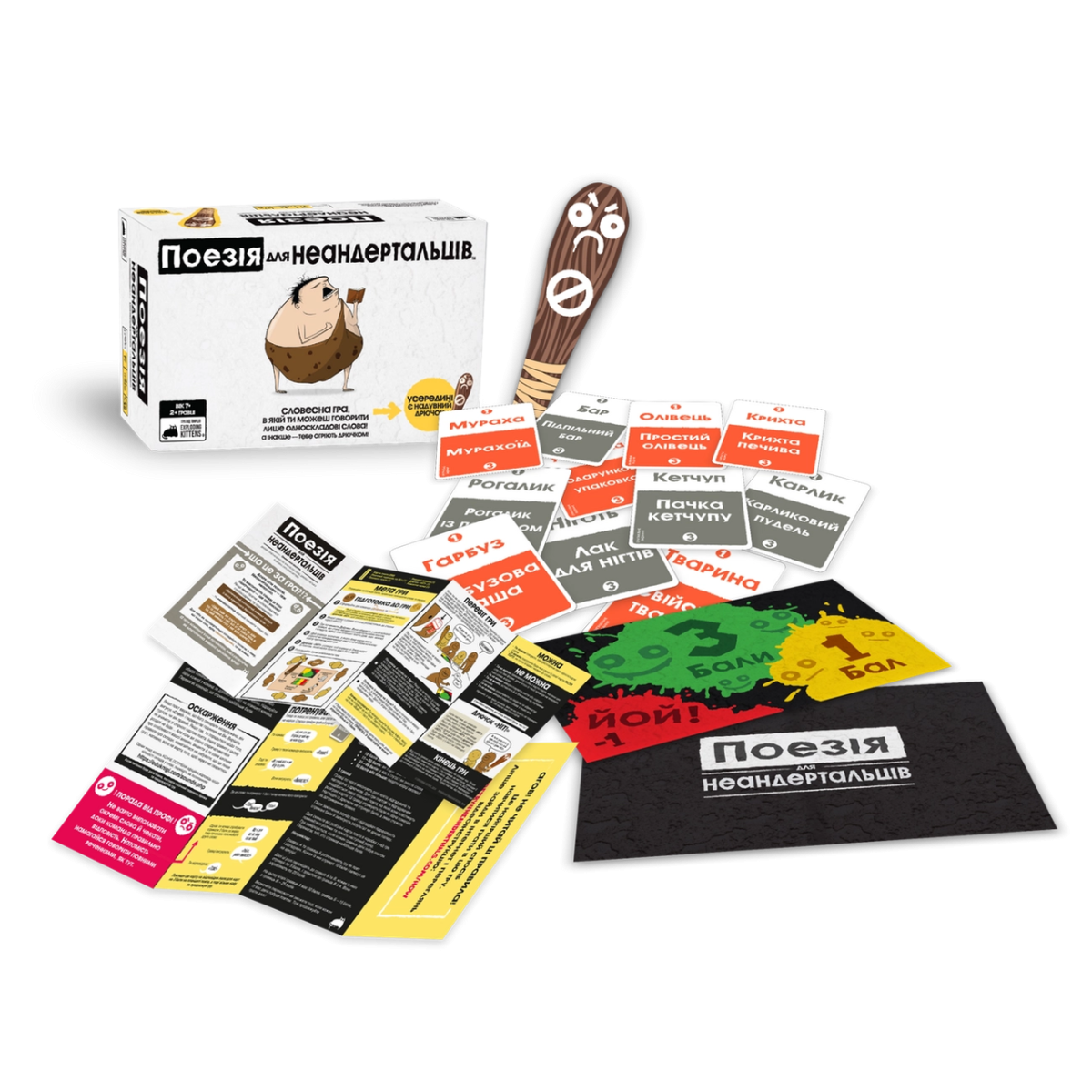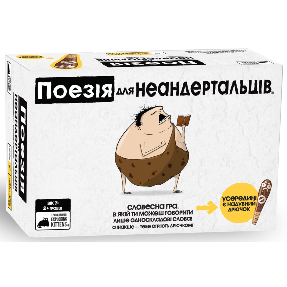 «Поезія для Неандертальців» — це весела та незвичайна настільна гра, яка змусить вас мислити, говорити і спілкуватися, як первісні люди! Гра розвиває навички комунікації та креативність, оскільки тут можна використовувати лише односкладові слова для пояснення понять. Оригінальне видання гри українською мовою подарує вашій вечірці гумор і захопливий час для всієї родини або компанії друзів.