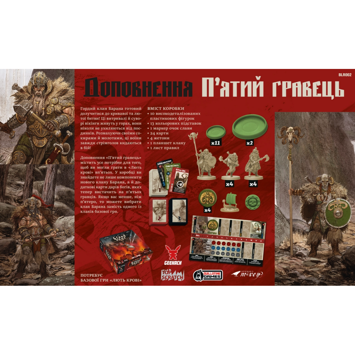 Нові мініатюри: в комплекті йдуть додаткові мініатюри воїна та кланового вождя, що дозволяють п’ятому гравцеві повноцінно брати участь у бойових діях.