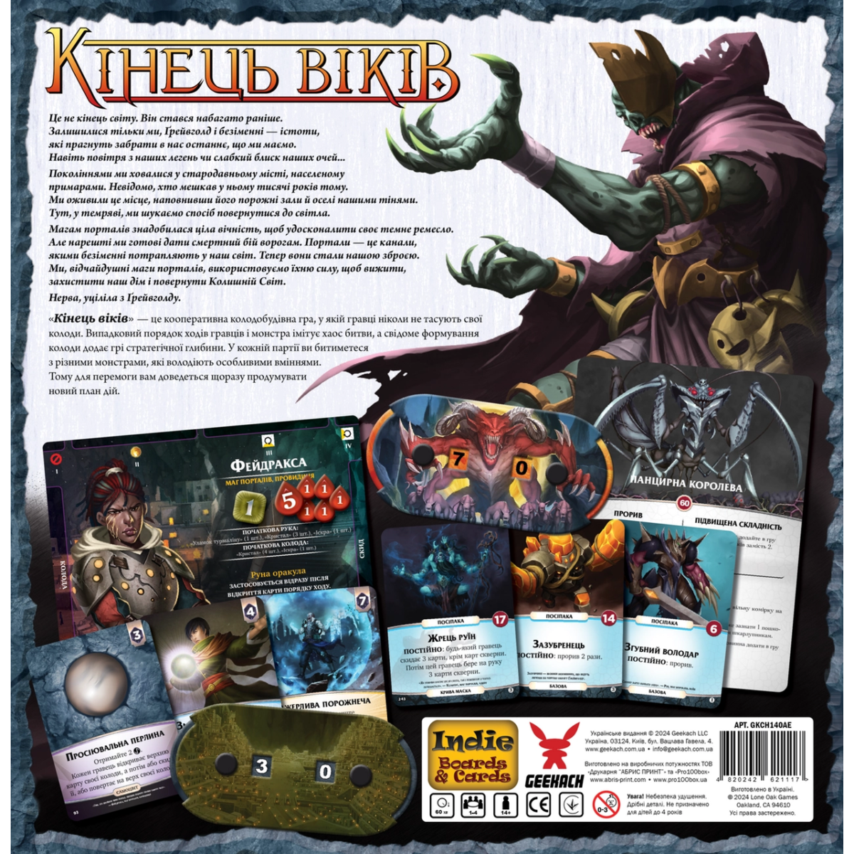 ???? Кінець віків (Aeon’s End) – кооперативна стратегічна гра, яка переносить гравців у світ магії та смертельних небезпек. Боріться з жахливими монстрами, захищайте Грейвхолд – останній прихисток людства, і використовуйте потужні колоди заклять для перемоги.