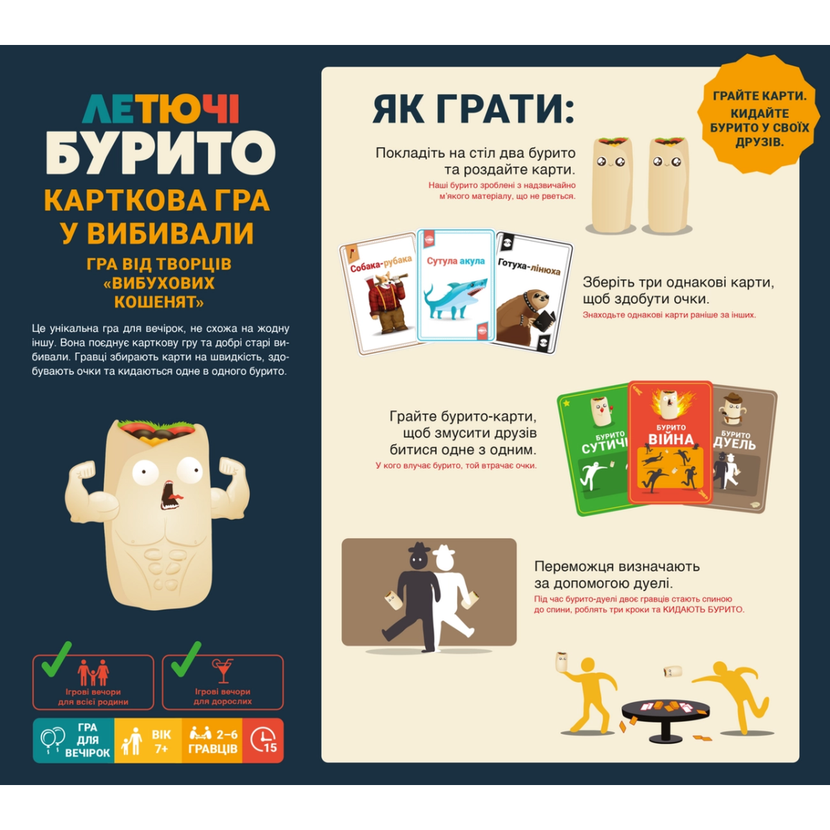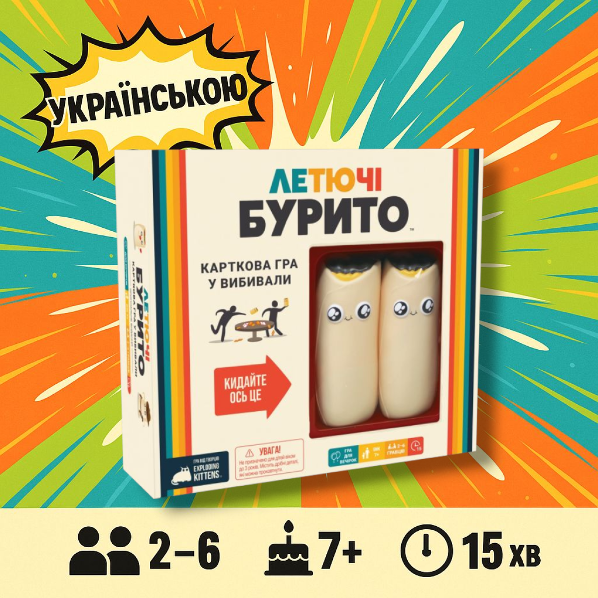 ???? Летючі бурито (Throw Throw Burrito) – це унікальна і весела настільна гра, яка поєднує карткову гру з активними діями! У цій грі вам доведеться метати буріто в своїх суперників. Як тільки буріто потрапить до ваших рук, будьте готові до справжньої битви за виживання!