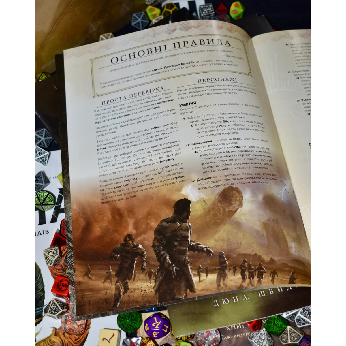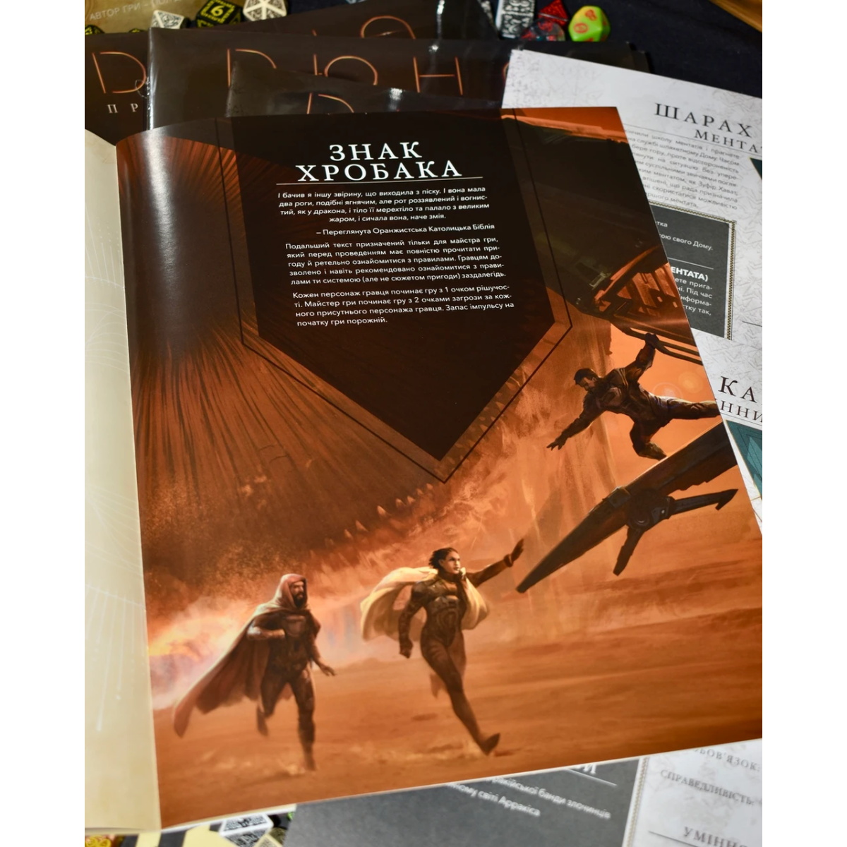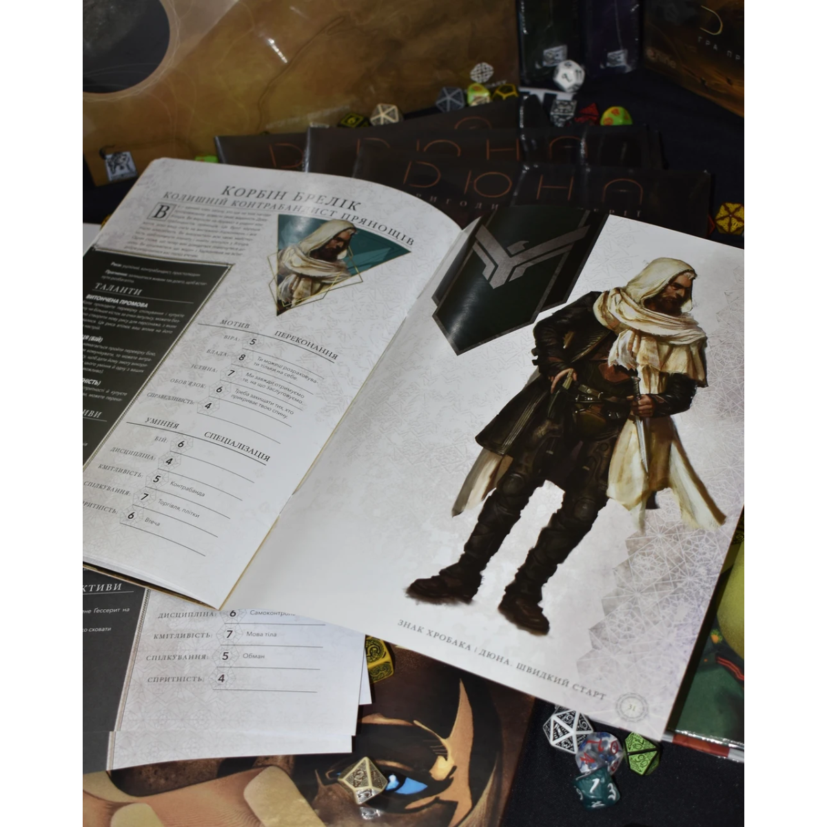 ???? Дюна. Пригоди в Імперії - Швидкий старт — це захоплююче введення в світ настільних рольових ігор за мотивами культової всесвіту Дюна. Якщо ви хочете поринути в атмосферу політичних інтриг, пустельних планет і епічних пригод, ця гра для вас! Це ідеальний старт для тих, хто лише починає свій шлях у світ рольових ігор, а також для шанувальників оригінальної серії книг і фільмів.