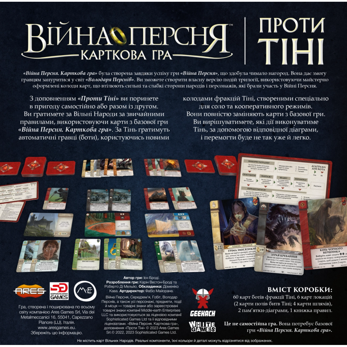 “Проти тіні“ – це ідеальний вибір для шанувальників базової гри “Війна Персня. Карткова гра“ та всіх, хто захоплюється фентезійними світами і стратегічними картковими іграми.