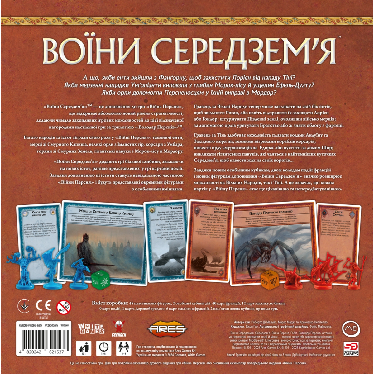 Війна Персня. Воїни Середзем’я ідеально підходить для фанатів оригінальної гри War of the Ring та для тих, хто хоче розширити свій ігровий досвід, поринувши в ще більш динамічні бої з участю нових героїв та армій. Це доповнення не тільки збагатить гру, але й привнесе елементи, що зроблять кожну партію унікальною.