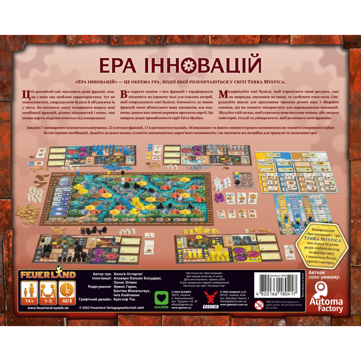 ???? Ера інновацій — настільна гра, яка занурює гравців у світ технологічних революцій та розвитку. У цій грі ви станете лідером країни, яка прагне розвиватися і досягти успіху в різних сферах. Гра унікальна тим, що поєднує елементи стратегії та інновацій, надаючи гравцям величезні можливості для розвитку і створення.