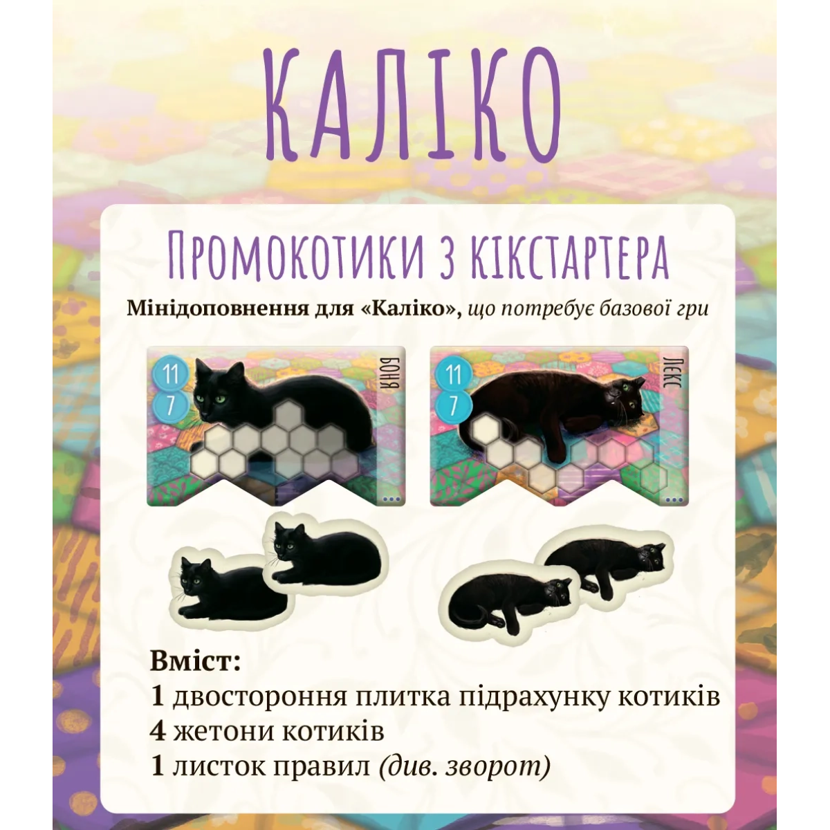 Якщо ви вже зачаровані настільною грою Каліко, тоді промо-набір від Kickstarter стане справжньою знахідкою! Цей ексклюзивний додаток відкриває нові можливості, щоб зробити вашу гру ще більш цікавою та різноманітною. Створюйте найкрасивіші ковдри, приваблюйте наймиліших котиків та насолоджуйтесь грою!