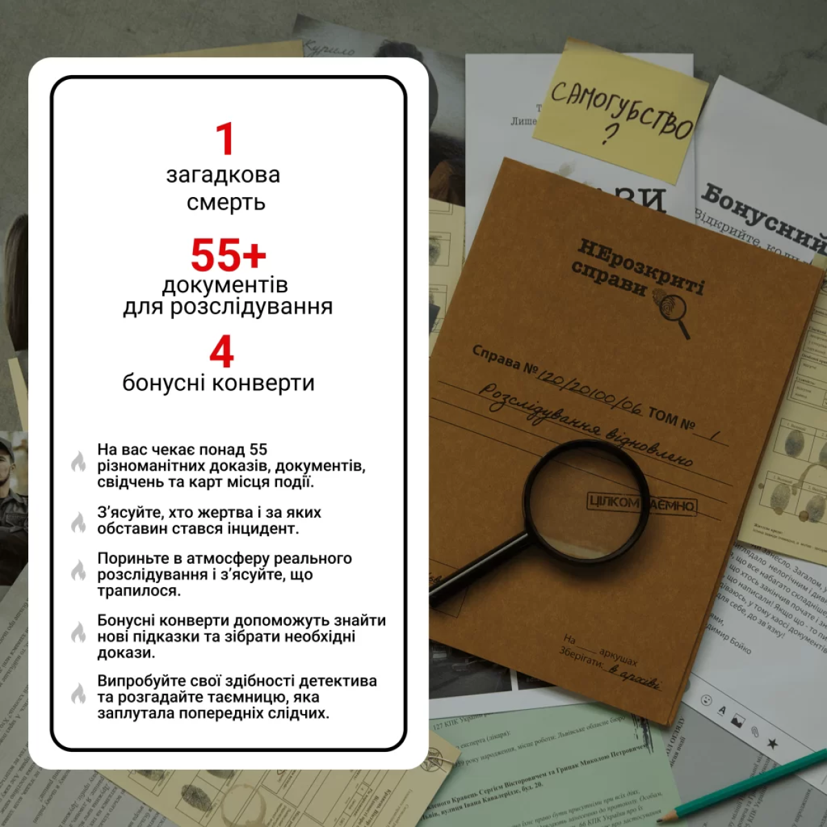 ???????????????? Для кого ця гра «Нерозкриті Справи #2» ідеально підходить для тих, хто любить логічні завдання, загадки та створення гіпотез. Вона чудово підходить для вечорів у компанії друзів або родини, а також для тих, хто цінує настільні ігри із захопливими сюжетами.