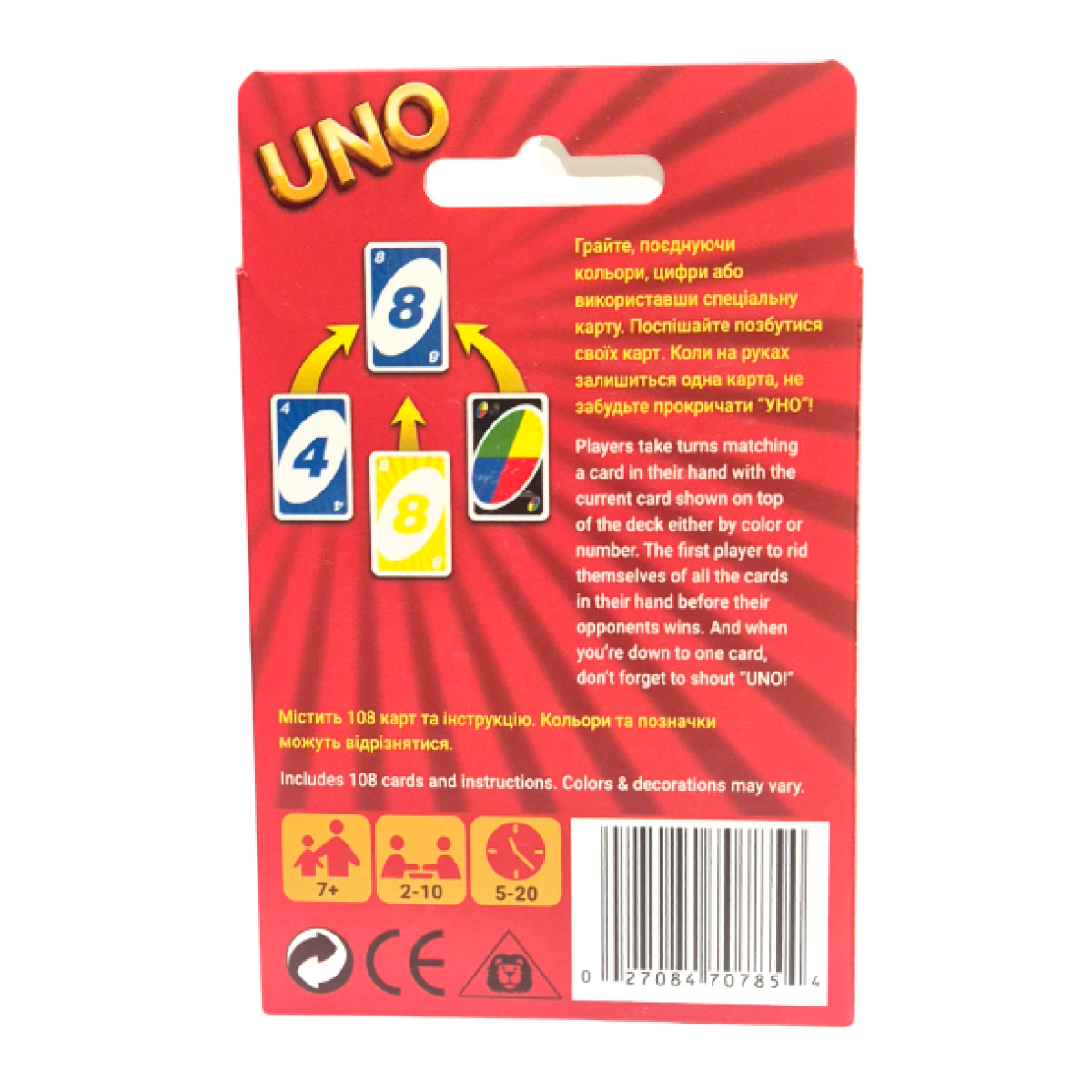 УНО – це легендарна карткова гра, яка дарує радість та азарт кожному гравцю! Тепер в оригінальному українському виданні, з якісним виконанням і сучасним дизайном.