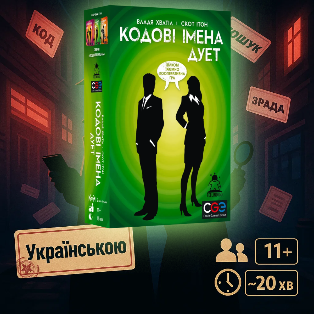 Кодові імена: Дует — це захоплююча та розумна гра на асоціації, в якій гравці працюють разом, щоб розгадати всі секрети та знайти сховані слова. Це кооперативна версія популярної гри Кодові імена, де ви і ваш партнер повинні діяти злагоджено та думати однаково, щоб виконати завдання. Чудово підходить для любителів розгадувати загадки та для тих, хто шукає гру, яка розвиває логічне мислення та командну роботу.