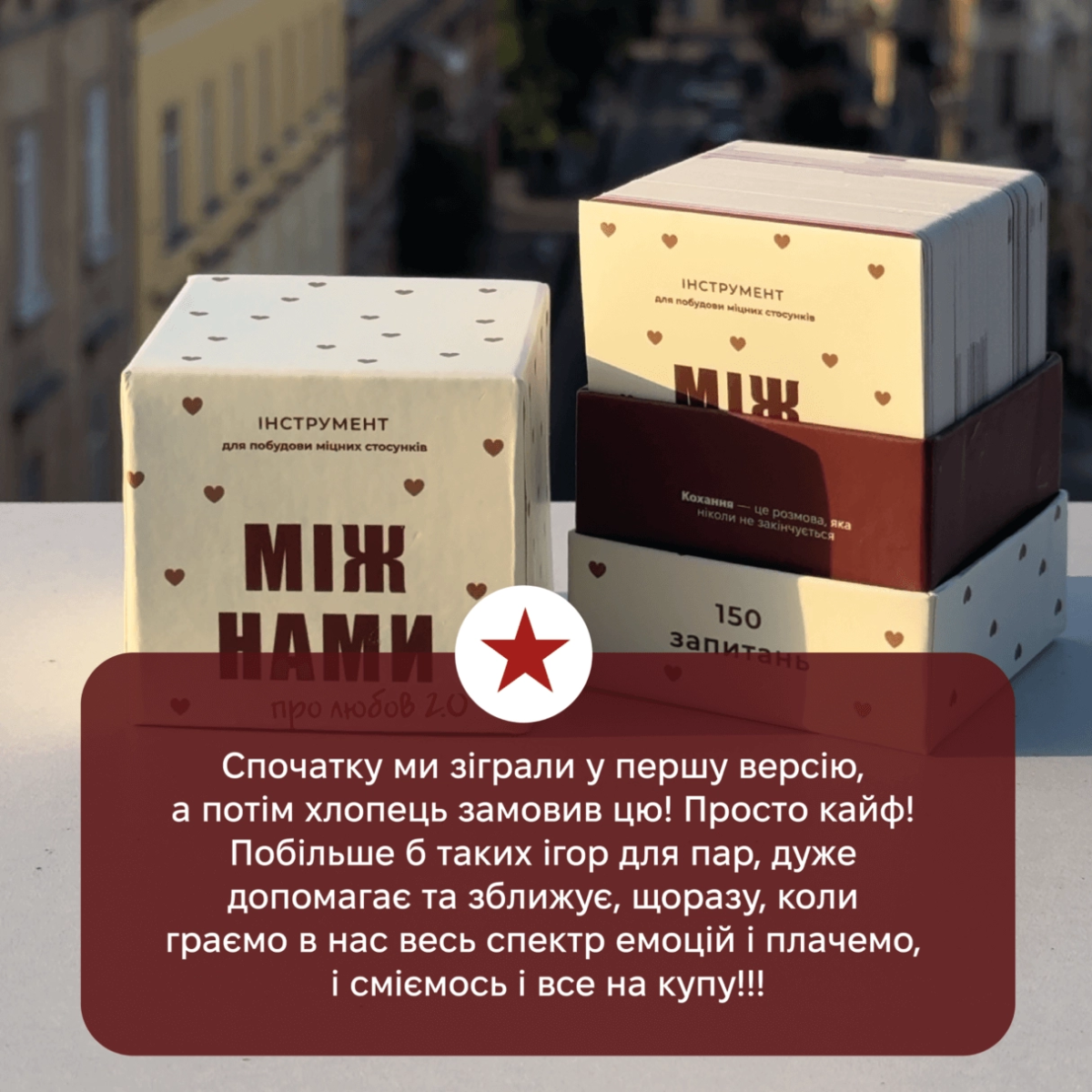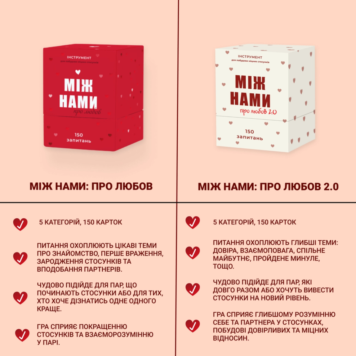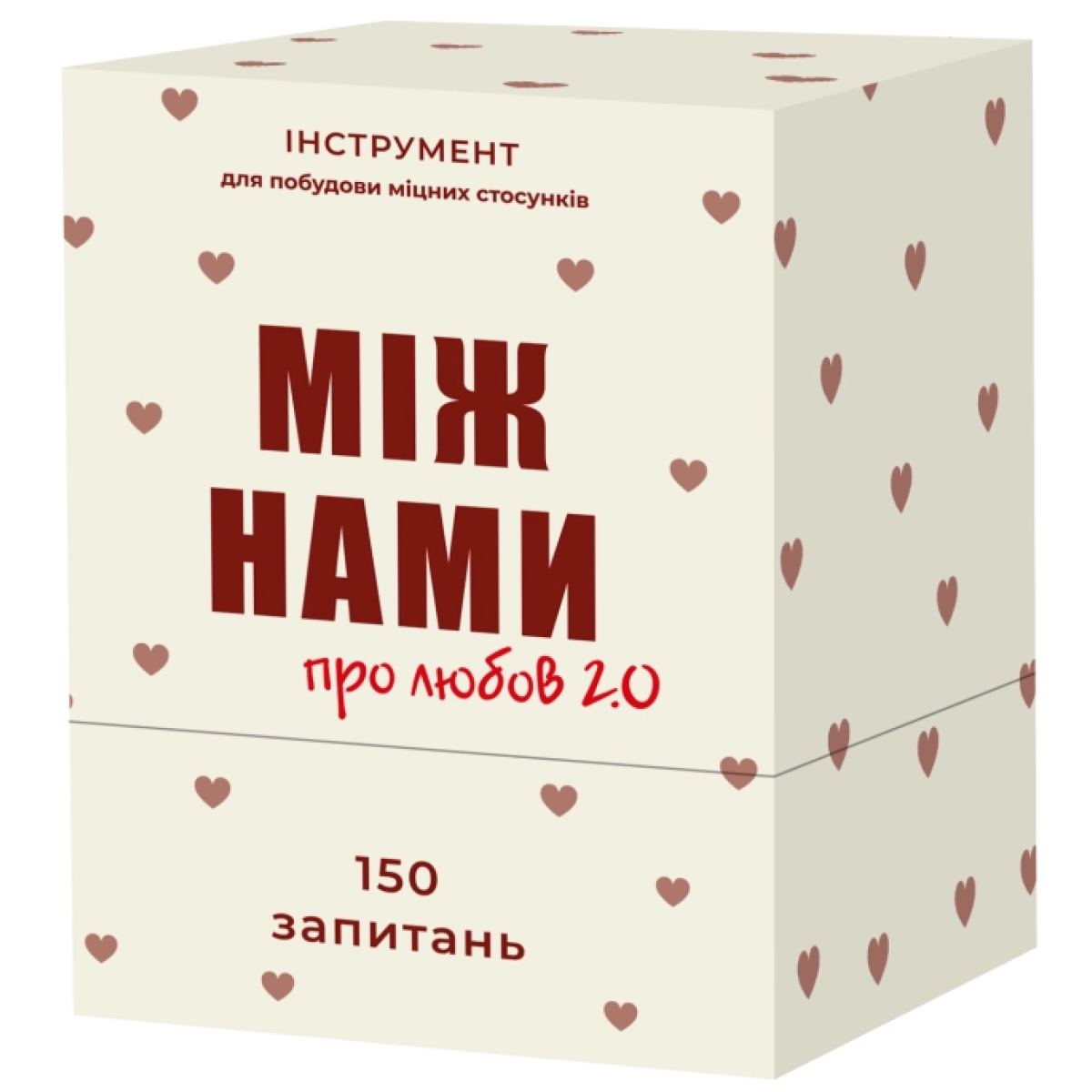 ???? «МІЖ НАМИ: ПРО ЛЮБОВ 2.0» – настільна гра, яка поглиблює відносини між гравцями через інтерактивні питання, що торкаються теми любові, стосунків і емоцій. Ця гра стане справжнім відкриттям для всіх, хто хоче краще пізнати свого партнера або друзів, а також пройти через низку захопливих моментів, що відкривають нові горизонти у стосунках.