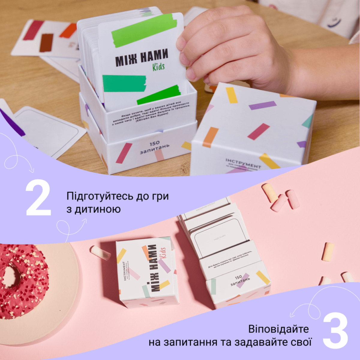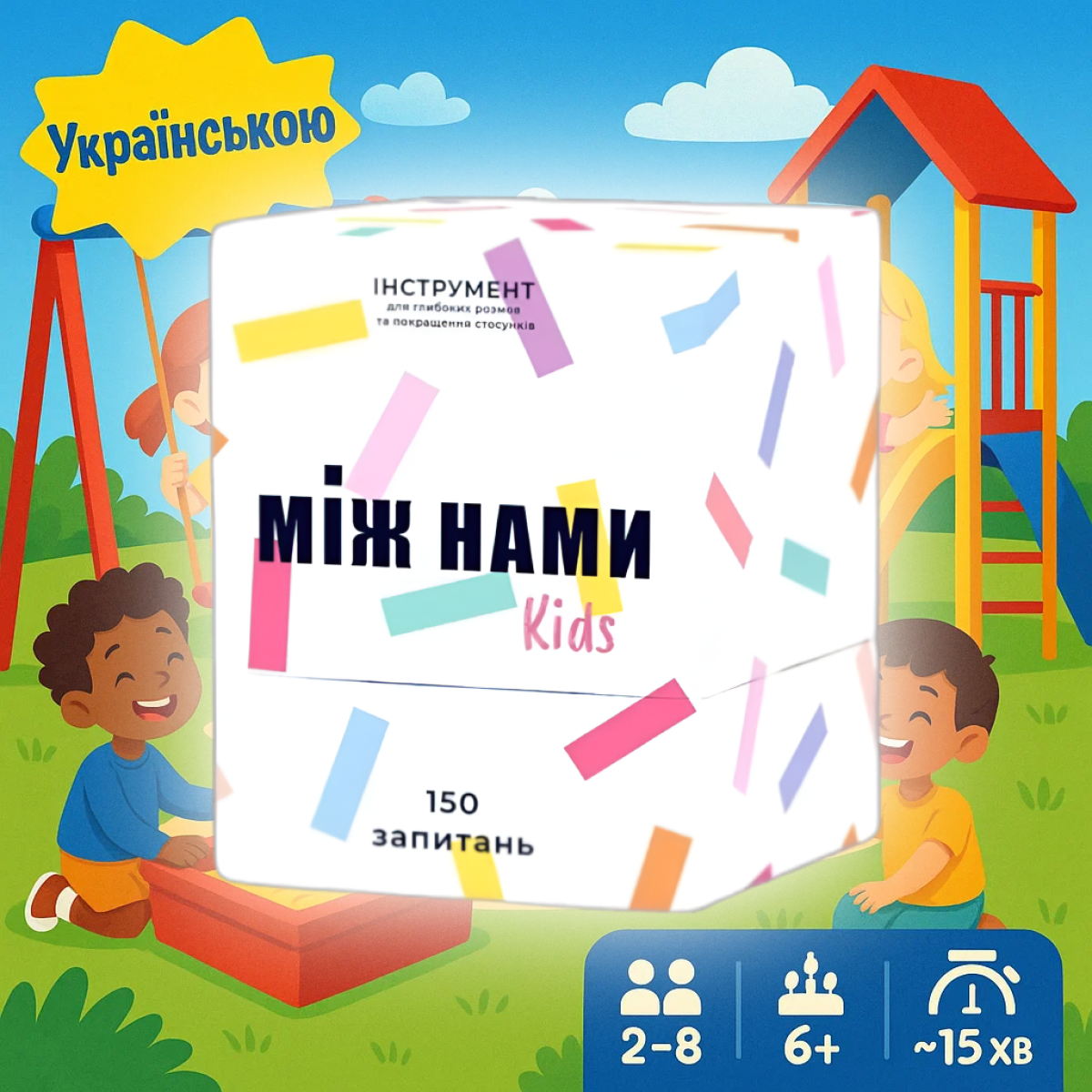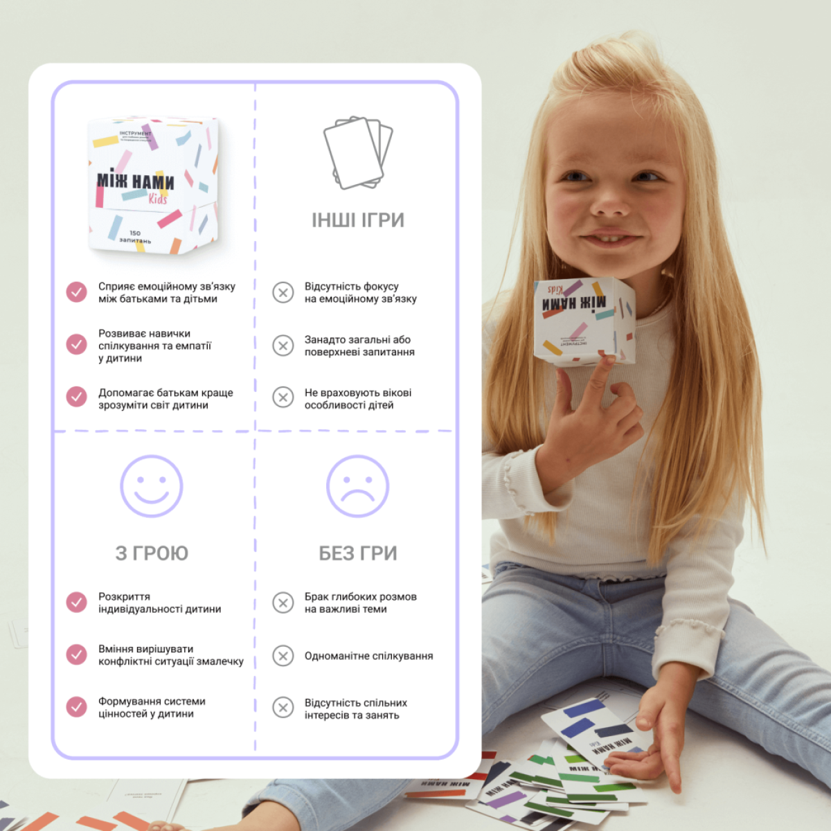 Навчання через гру: «МІЖ НАМИ: KIDS» допомагає дітям розвивати навички комунікації, розповіді про почуття, а також навчає їх взаємодії з іншими в доброзичливій атмосфері.