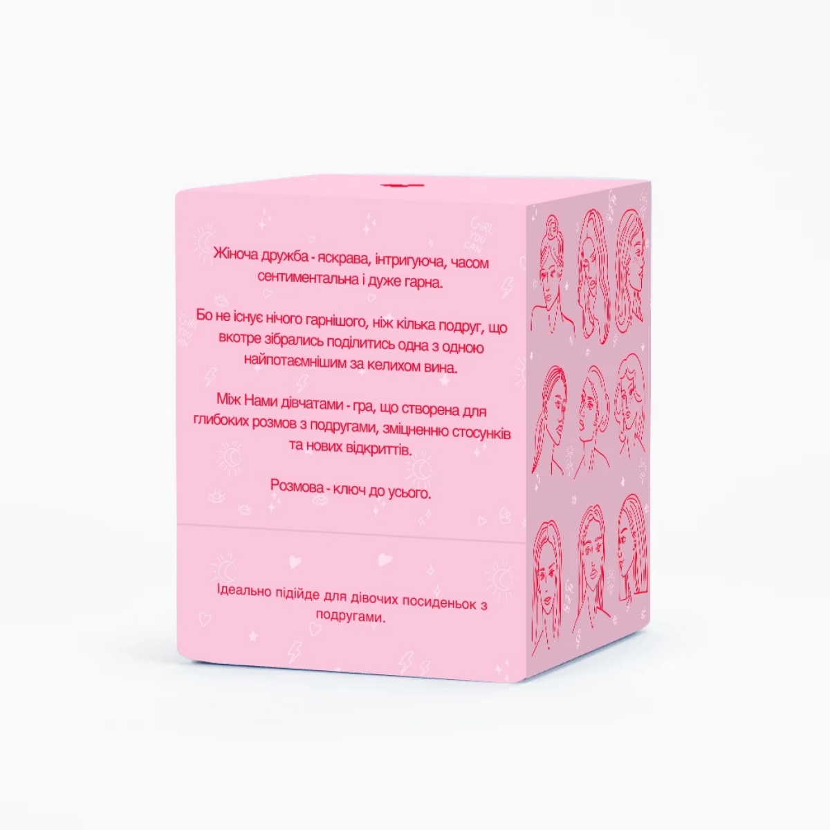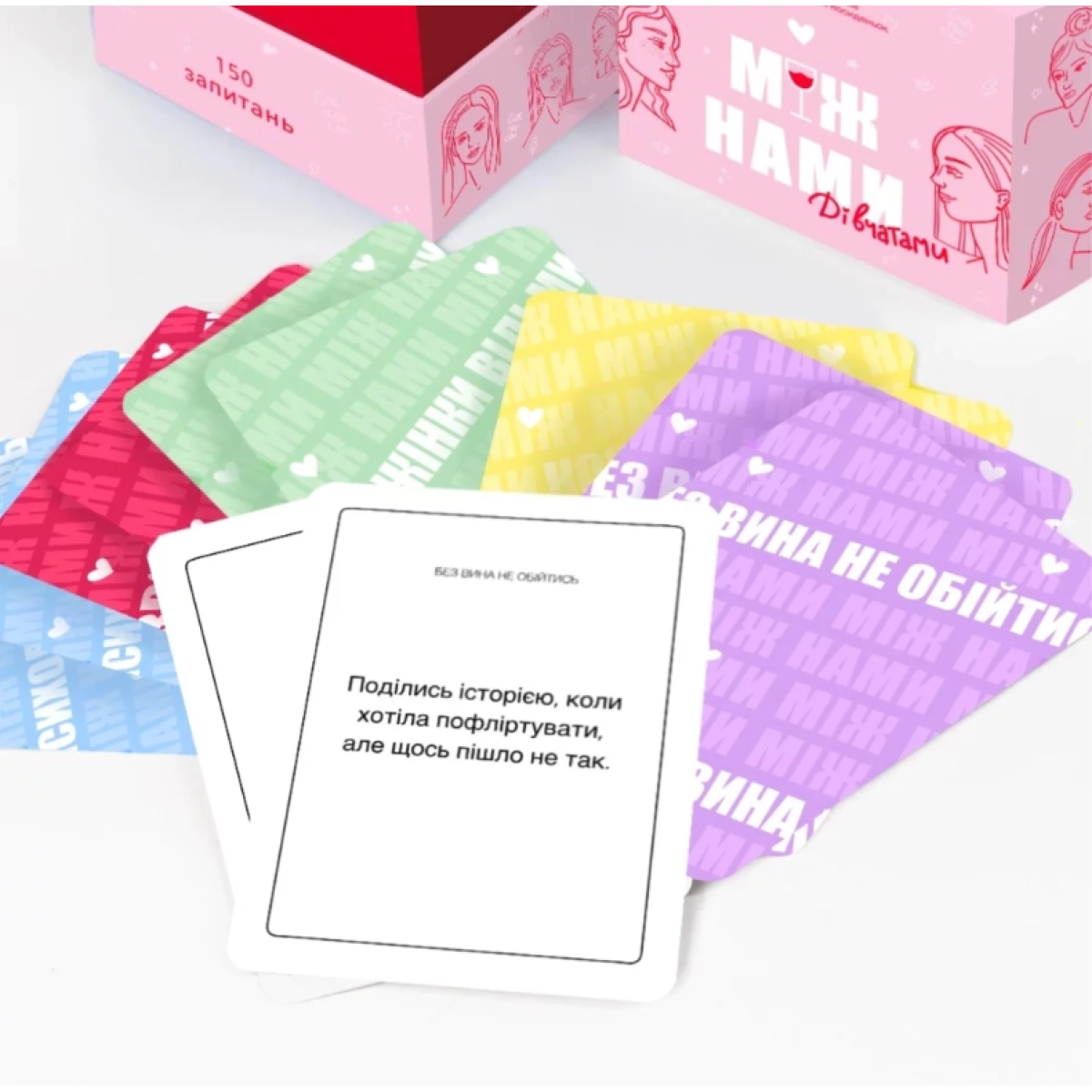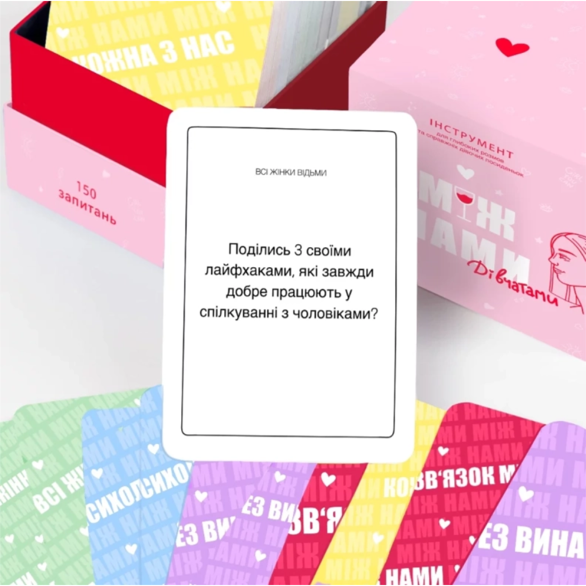 ???????????????? Для кого ця гра: «МІЖ НАМИ: ДІВЧАТАМИ» ідеально підходить для груп дівчат віком від 6 років, які хочуть поглибити своє спілкування, пізнати один одного та весело провести час. Це чудова гра для вечірок, посиденьок з подругами або родинних зустрічей.