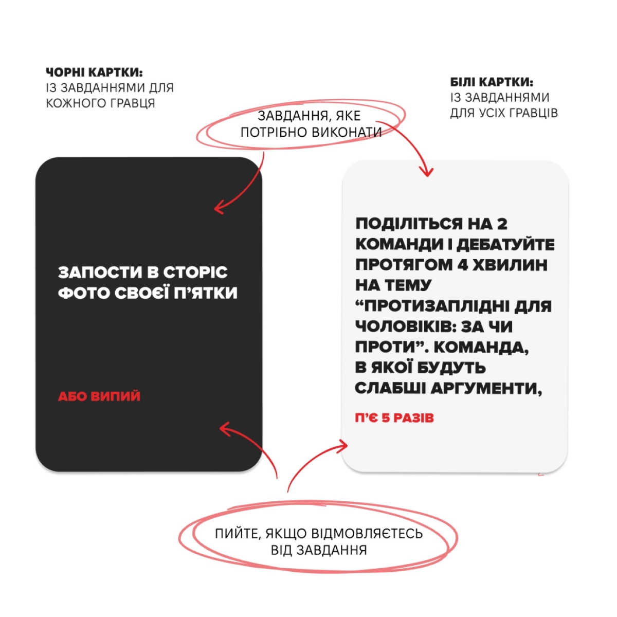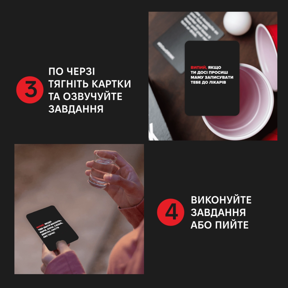 Ідеально підходить для дружніх зустрічей, вечірок та будь-яких заходів, де потрібен драйв та весела атмосфера. Віковий поріг – від 18 років, оскільки завдання можуть бути не зовсім дитячими.
